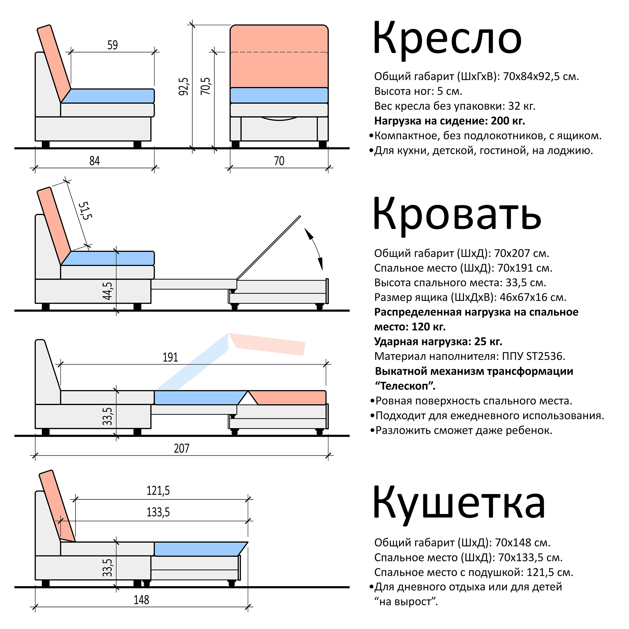Кресло-кровать "Экономик" в сложенном виде представляет собой компактное кресло с ящиком для белья, а в разложенном виде имеет полноценное спальное место. Чтобы получилась "кушетка" для дневного отдыха или для детей "на вырост", нужно отстегнуть подушку и выдвинуть механизм на нужную длину.