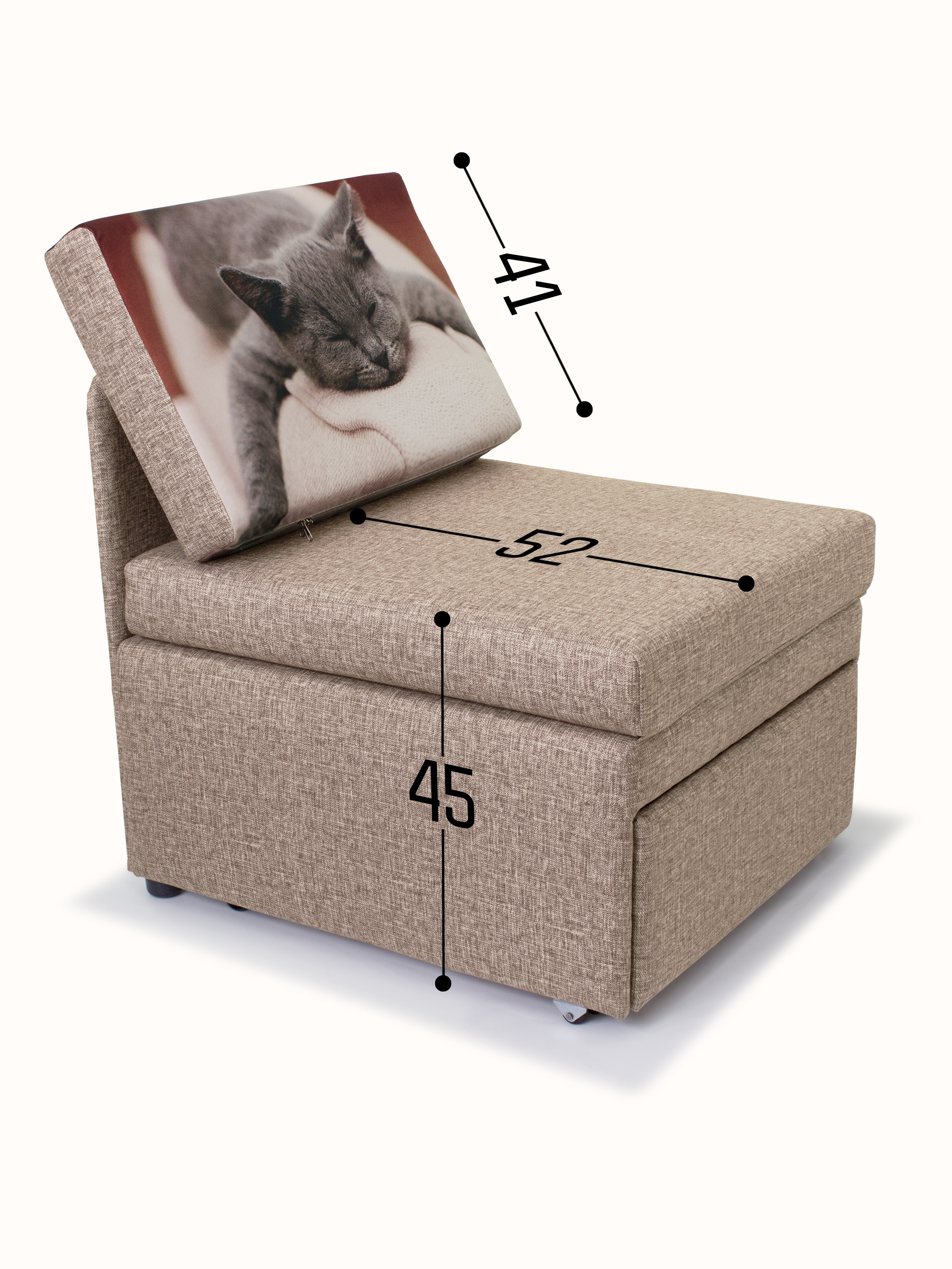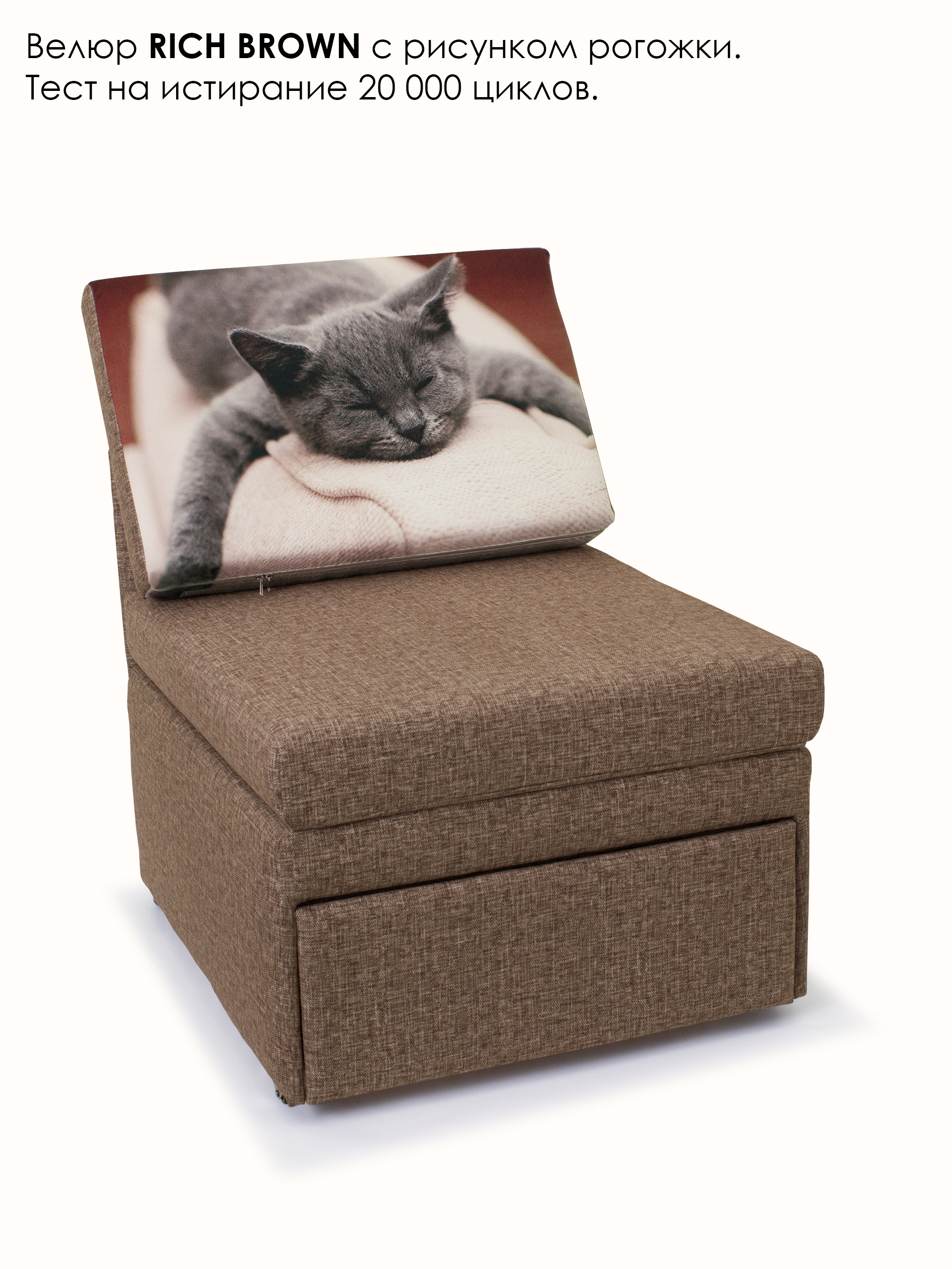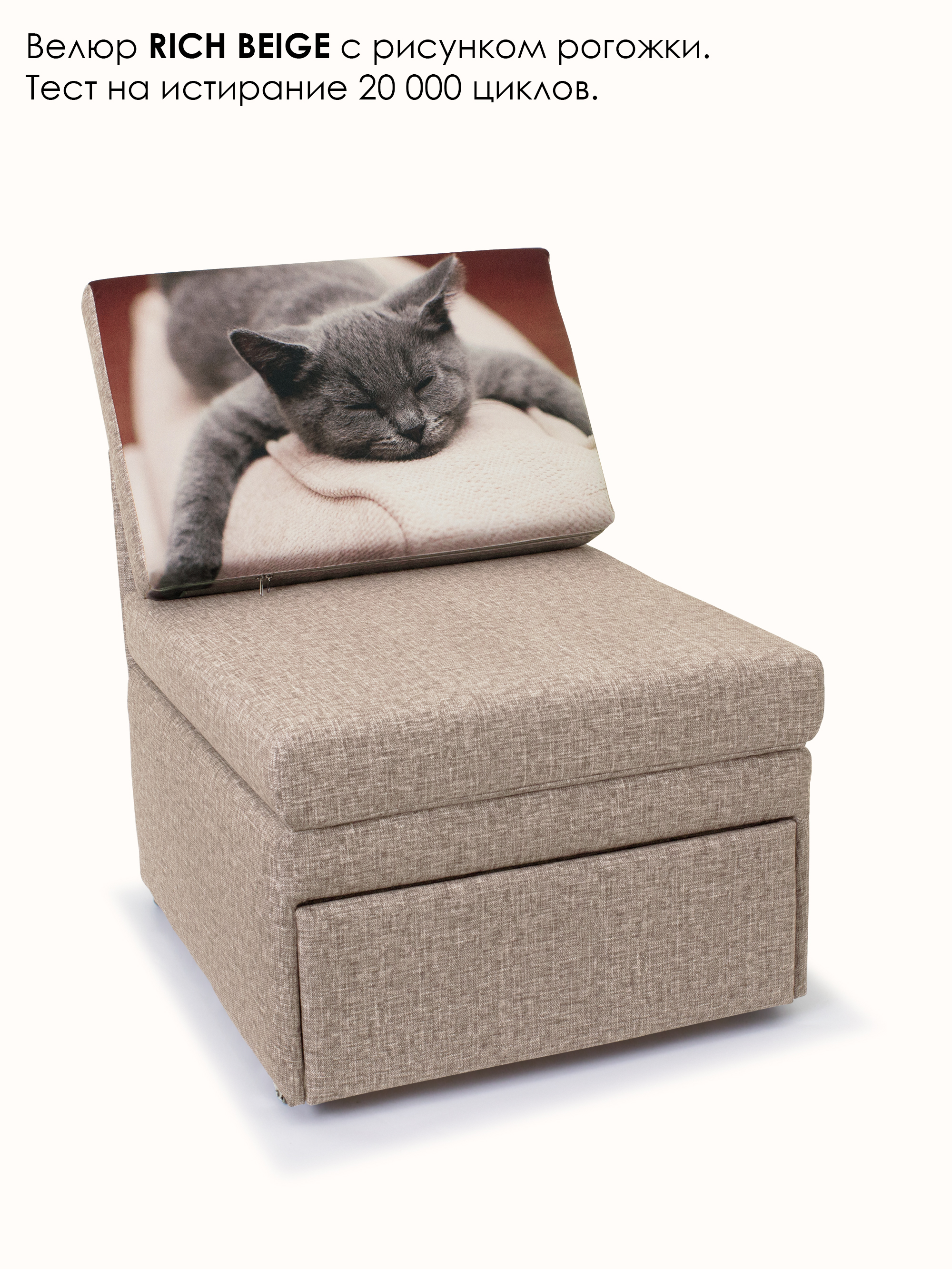 Материал обивки: Велюр Rich (Состав: полиэстер (PES) 100%. Показатель устойчивости к истиранию для велюра составляет 20 000 циклов). Купон велюровый "Кот спит". Съемный чехол только на подушке спинки.