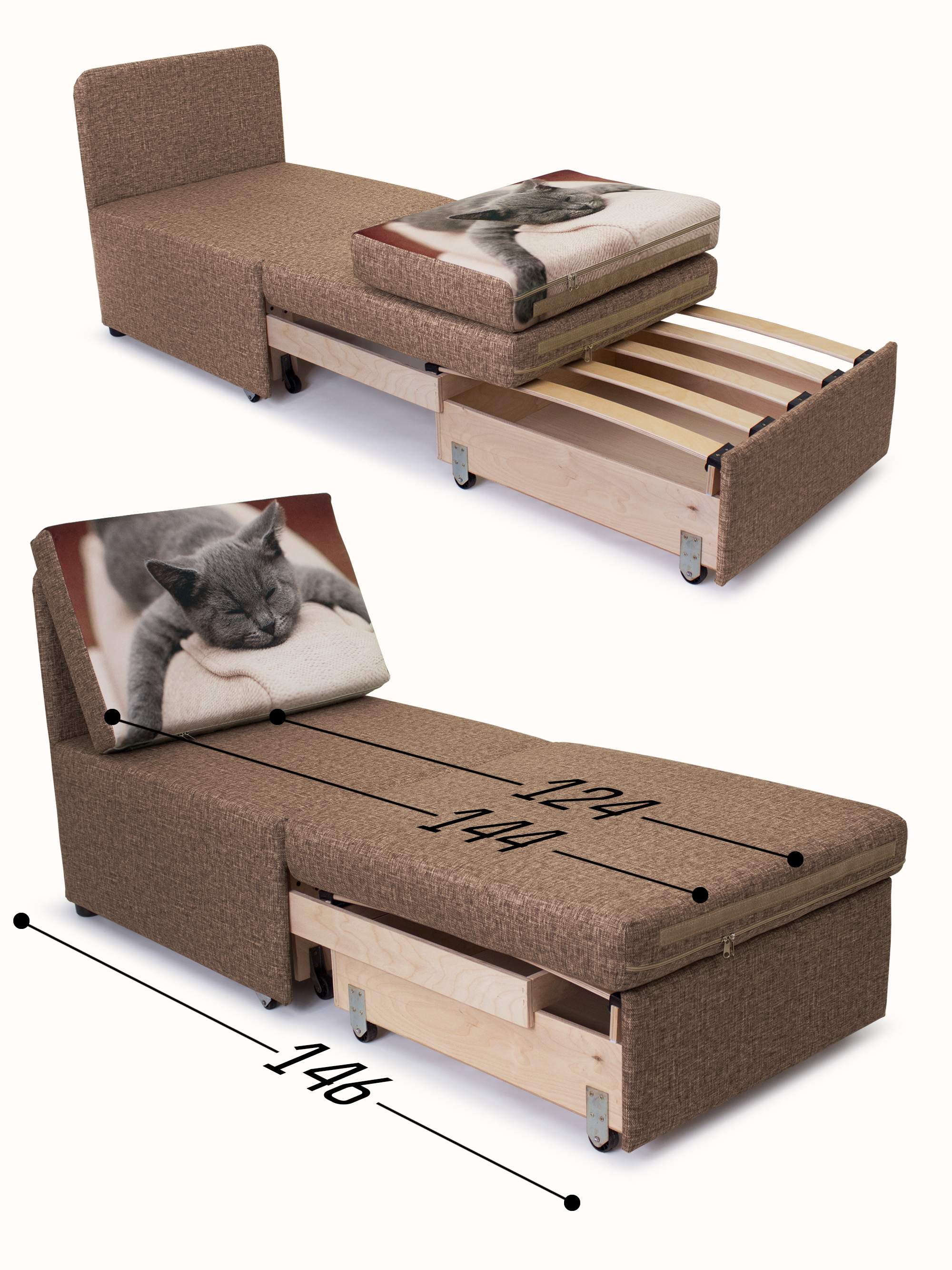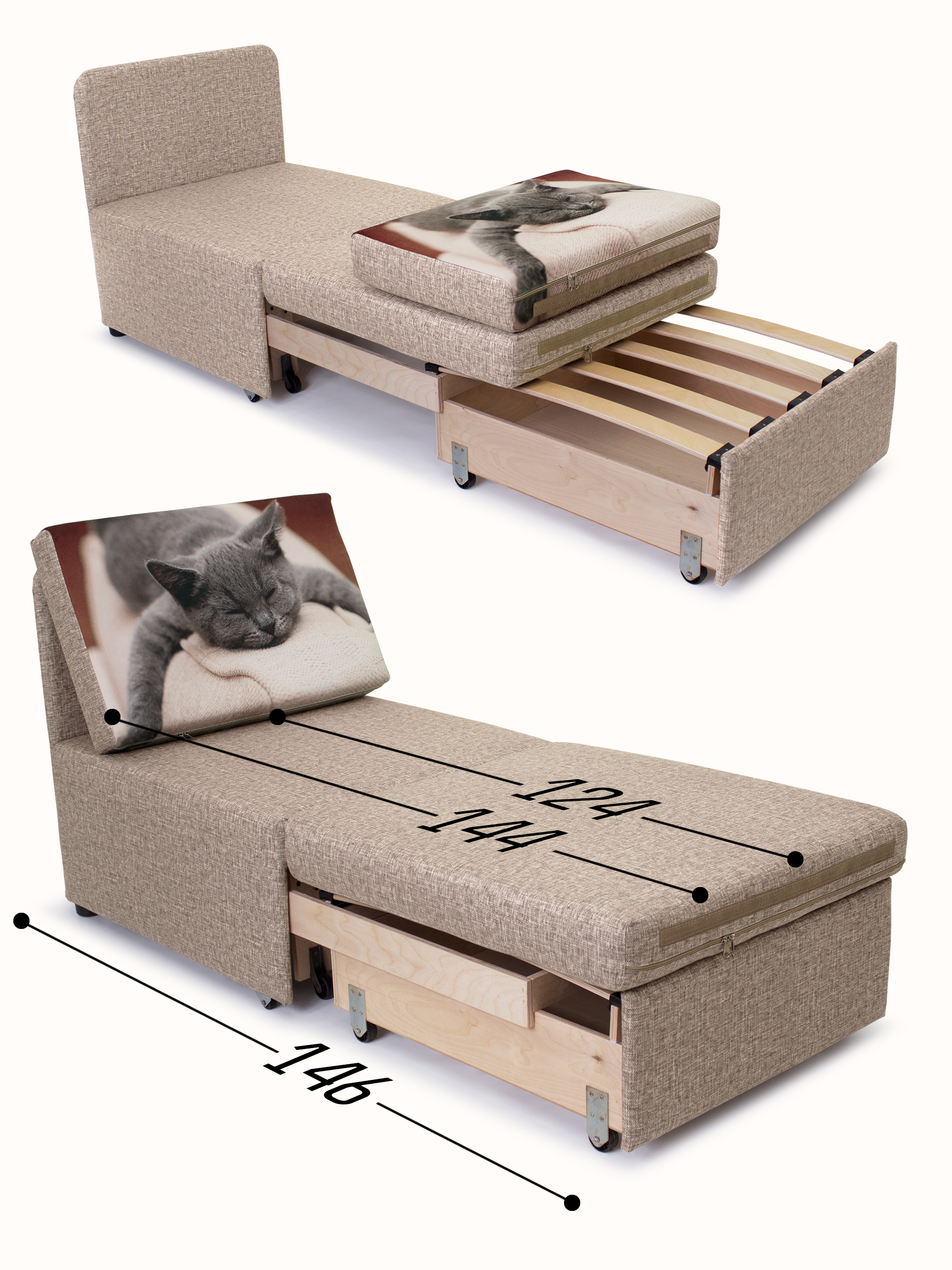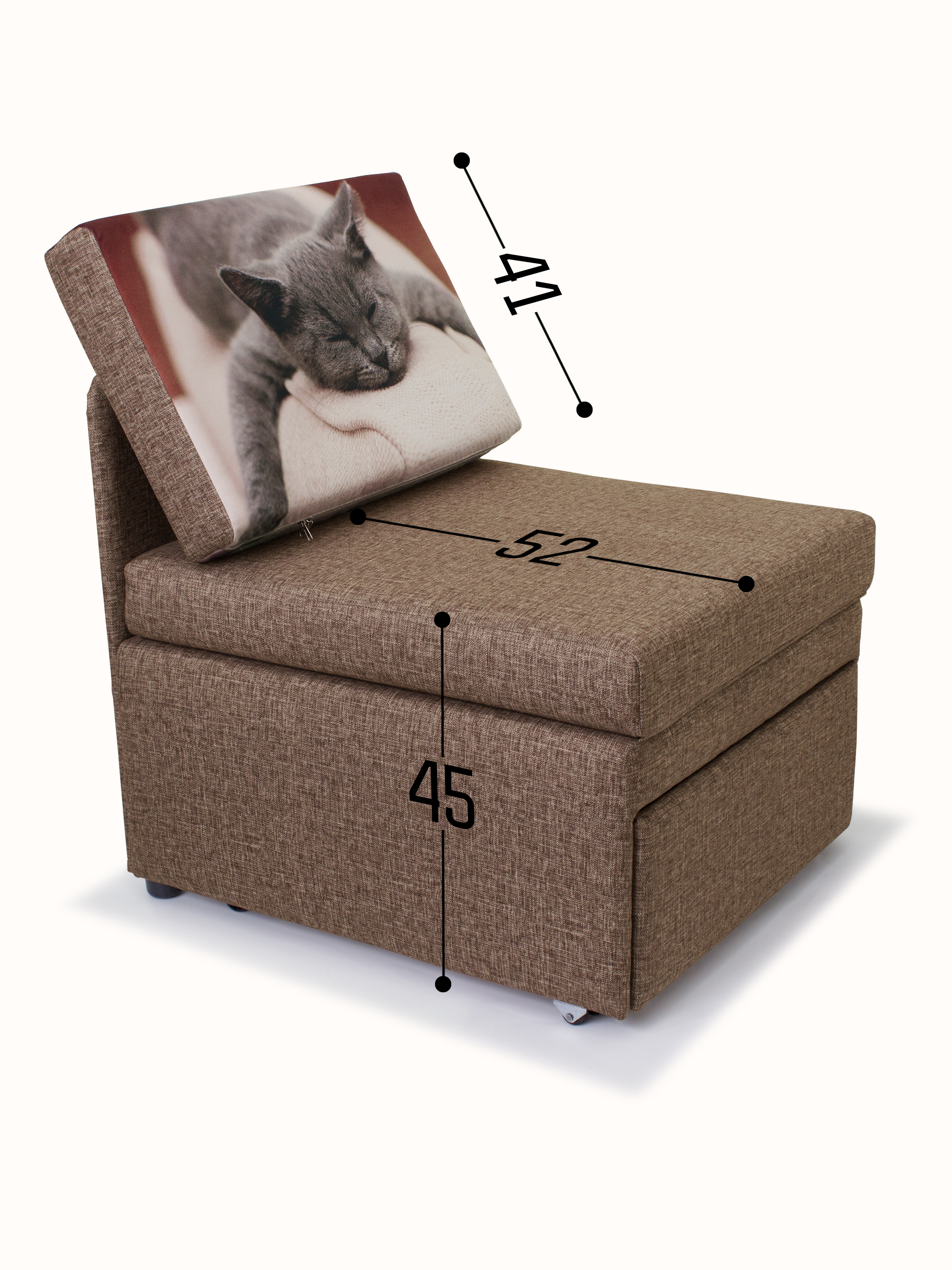 Материал обивки: Велюр Rich (Состав: полиэстер (PES) 100%. Показатель устойчивости к истиранию для велюра составляет 20 000 циклов). Купон велюровый "Кот спит". Съемный чехол только на подушке спинки.