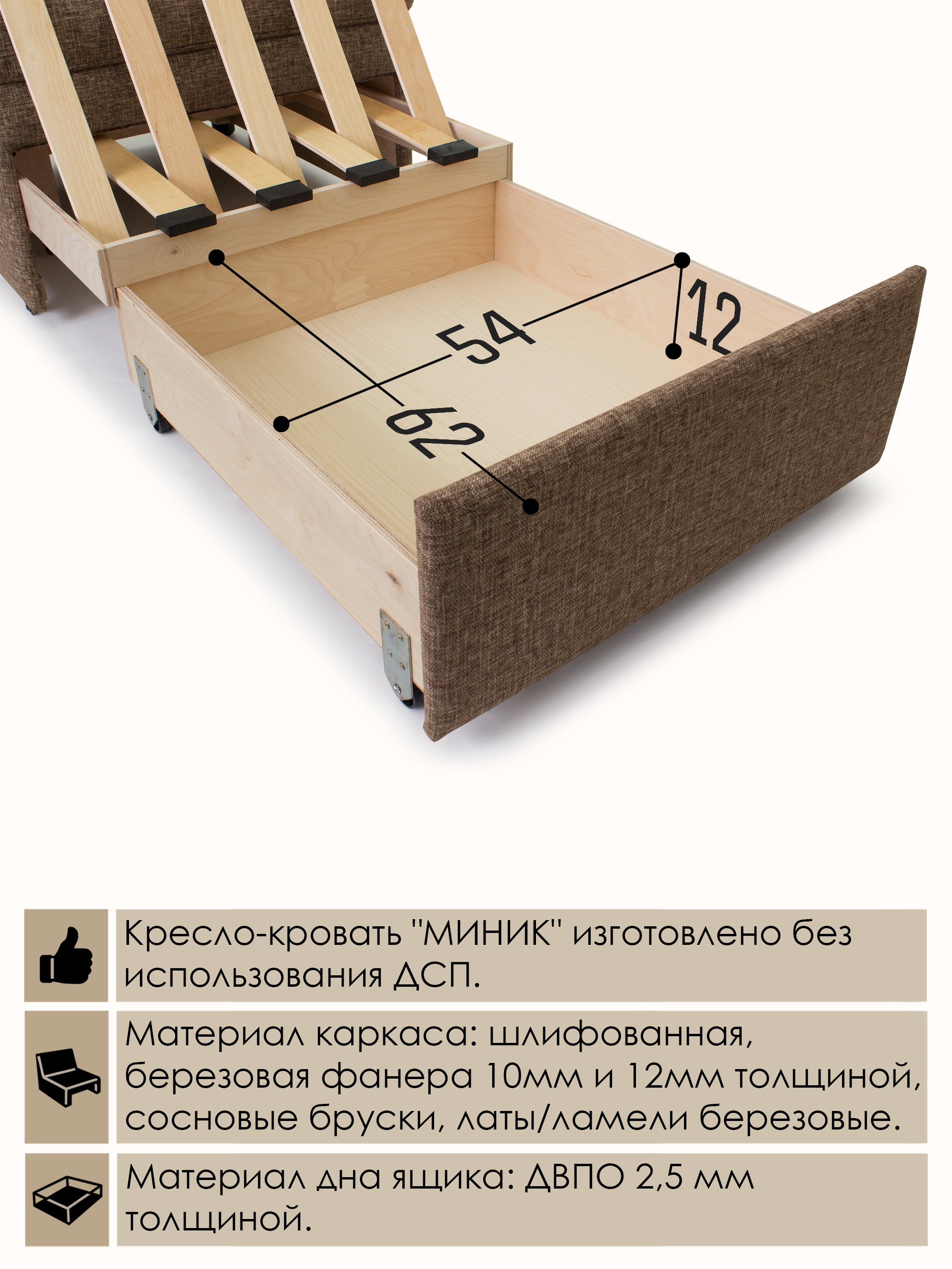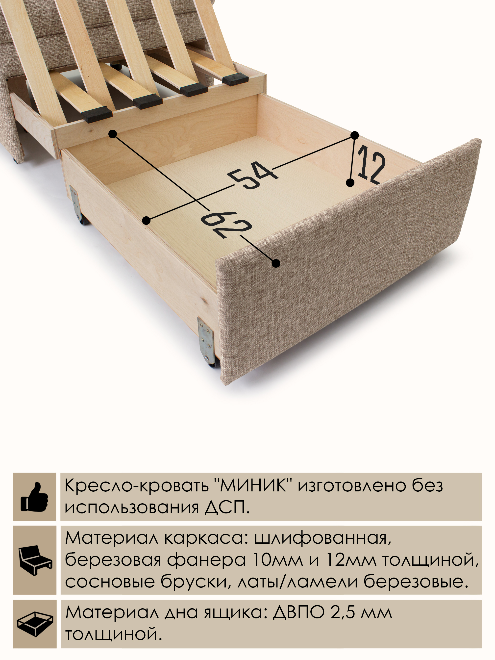 Материал каркаса: Шлифованная березовая фанера, березовые латы, сосновые бруски; дно ящика - ДВПО.