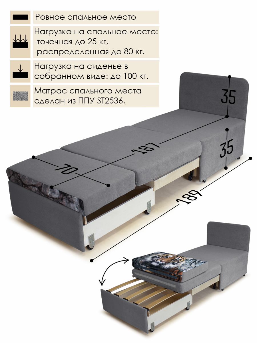 • распределенная нагрузка на спальное место - 80 кг, точечная нагрузка* на спальное место - 25 кг. Нагрузка на кресло в собранном виде - 100 кг.
