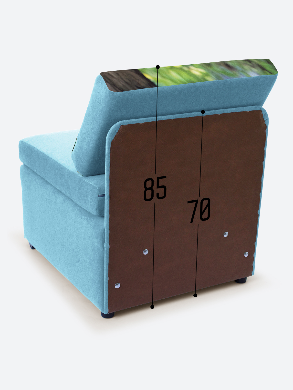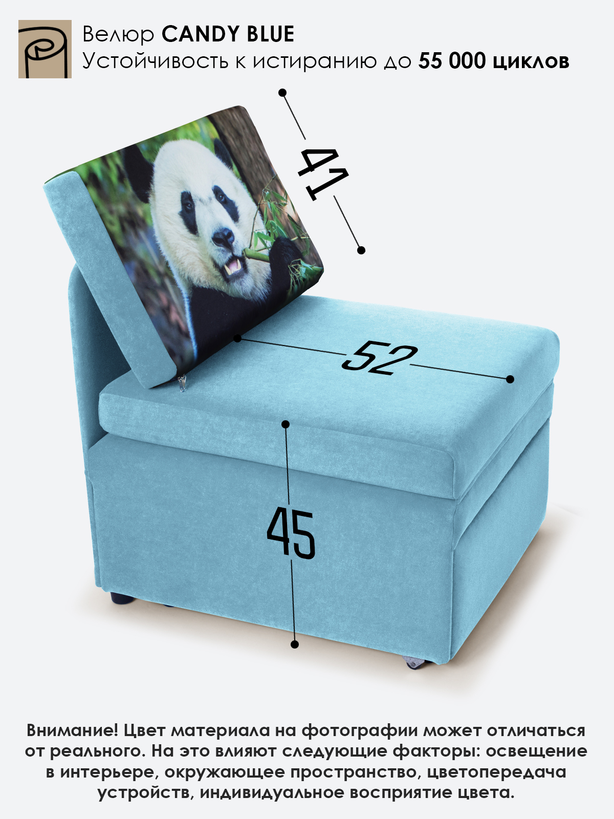 Материал обивки: Велюр CANDY (Состав: полиэстер (PES) 100%. Плотность 350 г/кв.м. Показатель устойчивости к истиранию для велюра составляет 55000 циклов). Купон велюровый. Съемный чехол только на подушке спинки.