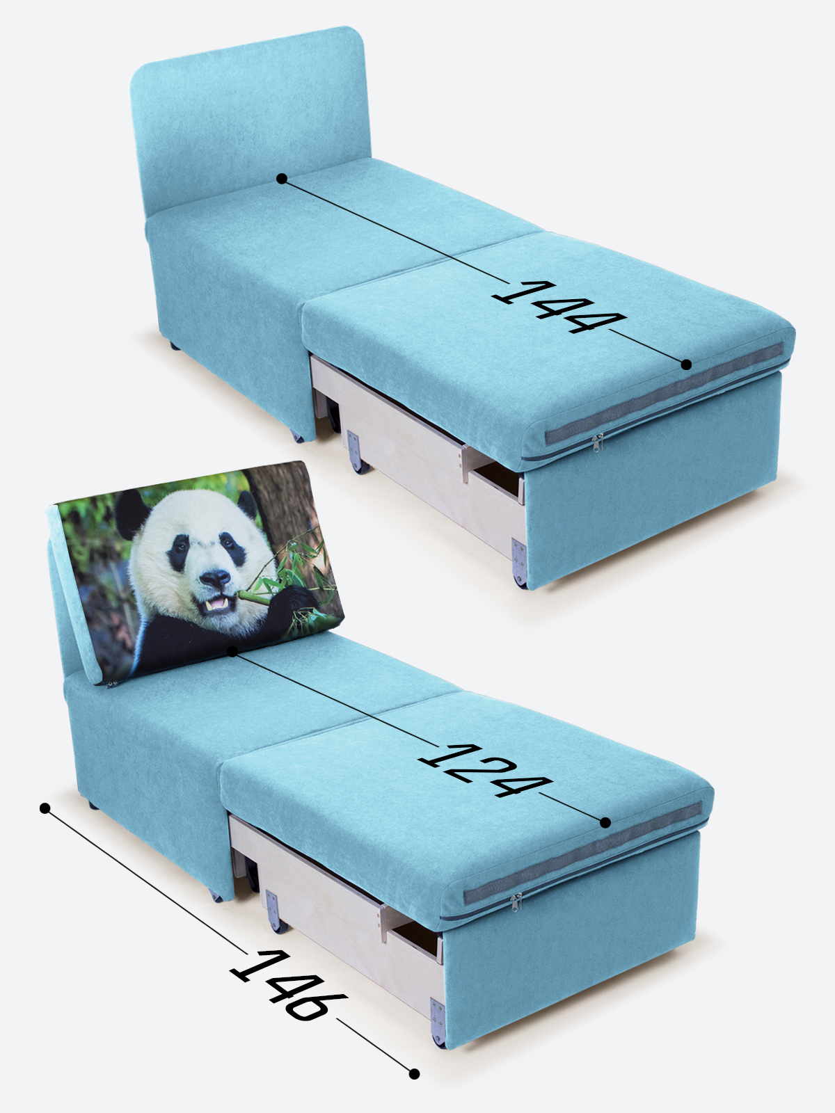 - спальное место, когда кресло разложено на 2/3 длины (кушетка/на вырост) - 65х144х35;