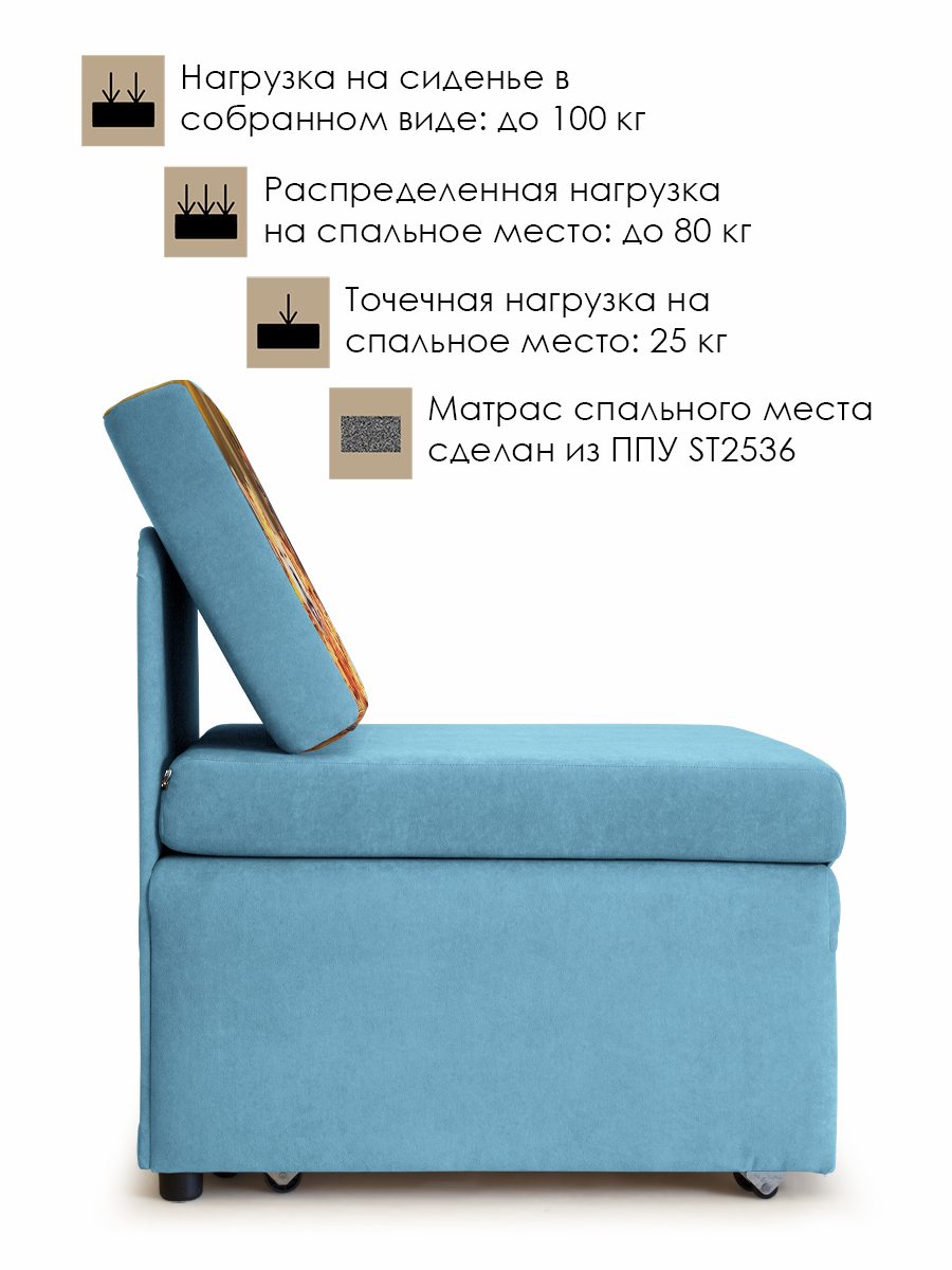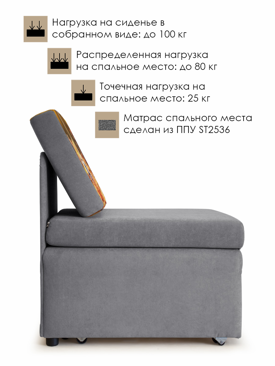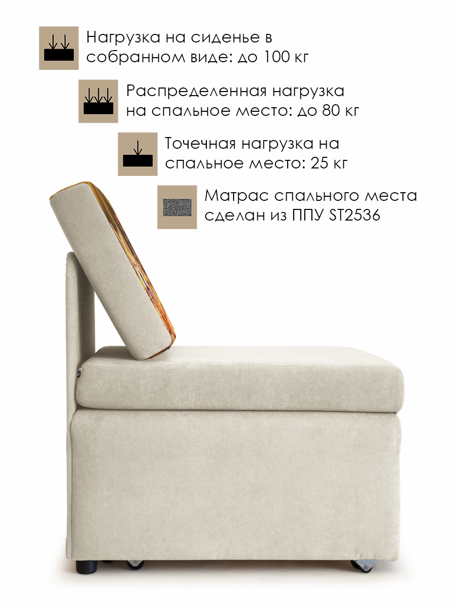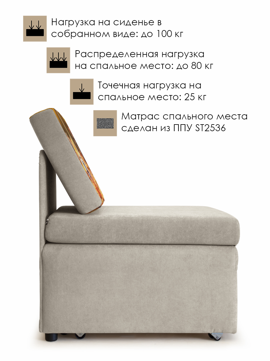 - распределенная нагрузка на спальное место - 80 кг, точечная нагрузка* на спальное место - 25 кг. Нагрузка на кресло в собранном виде - 100 кг.