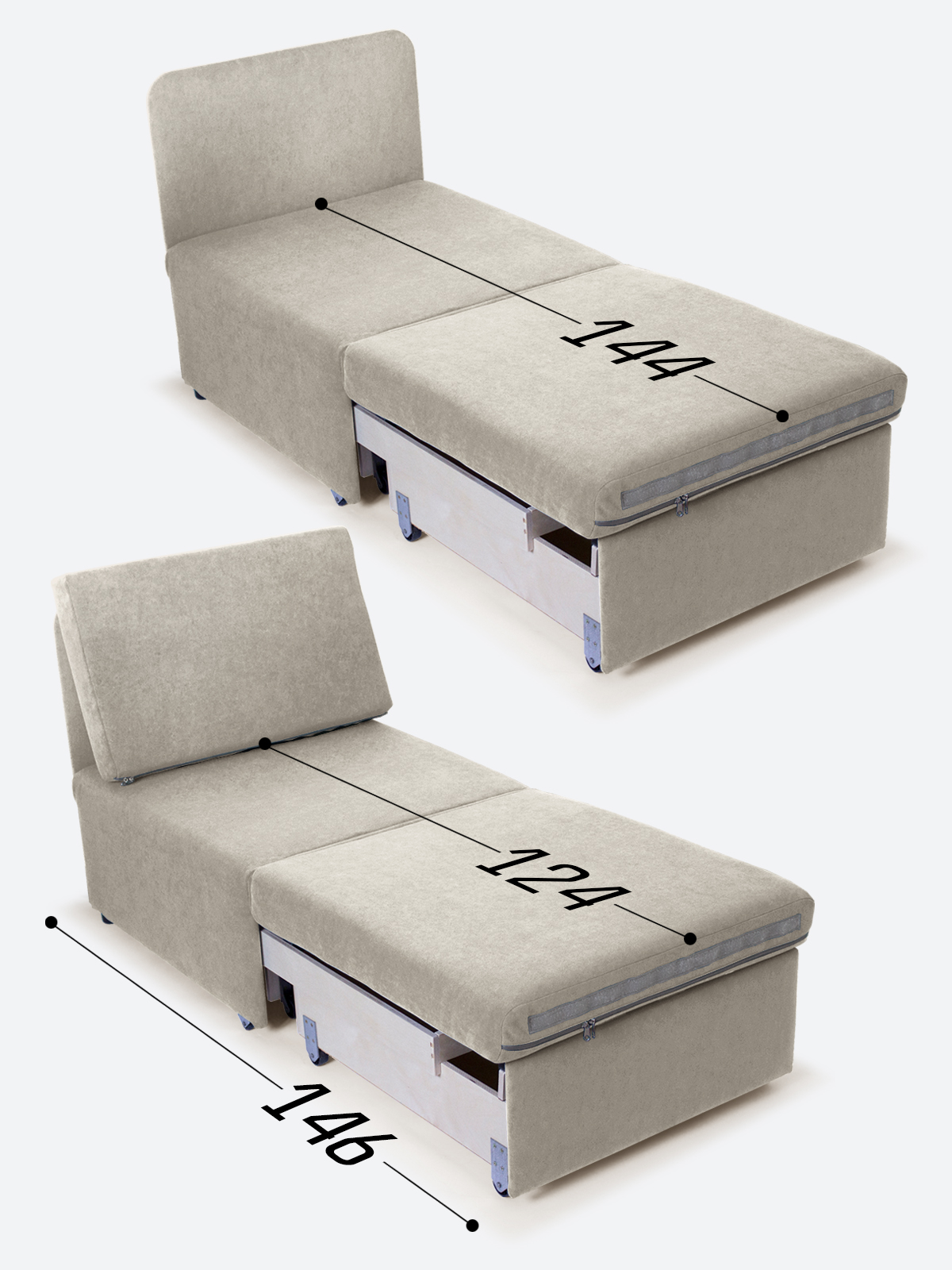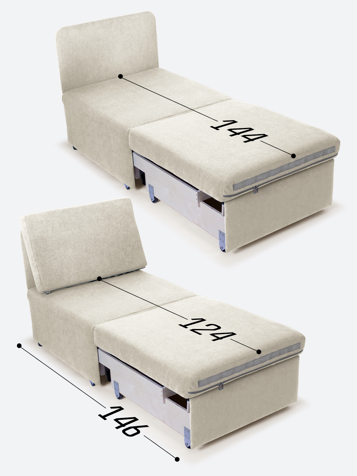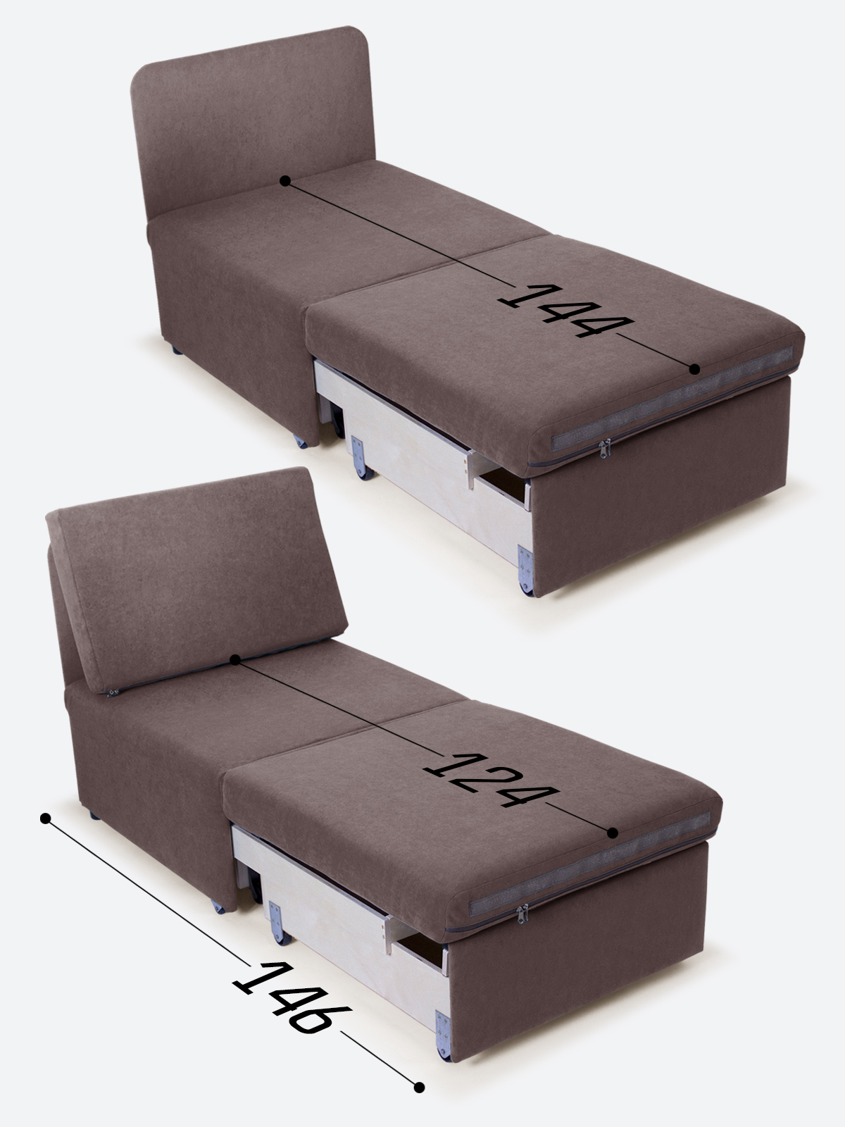 - спальное место, когда кресло разложено на 2/3 длины (кушетка/на вырост) - 65х144х35;