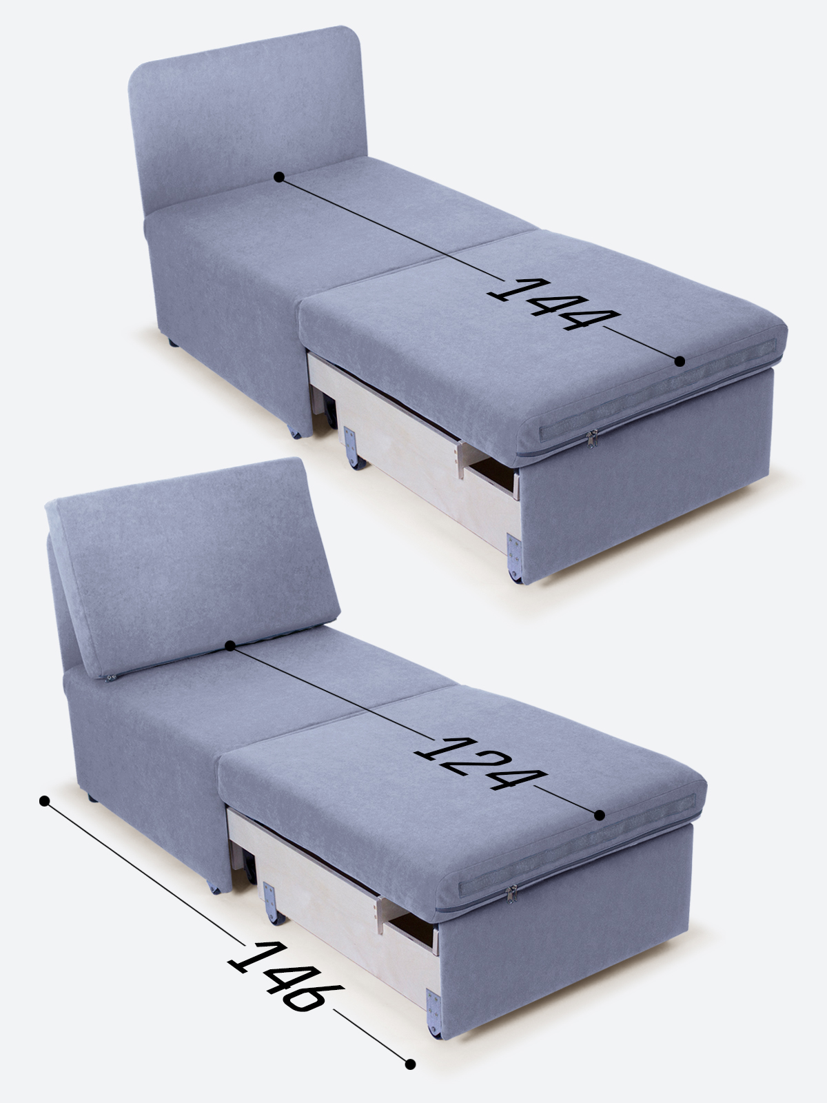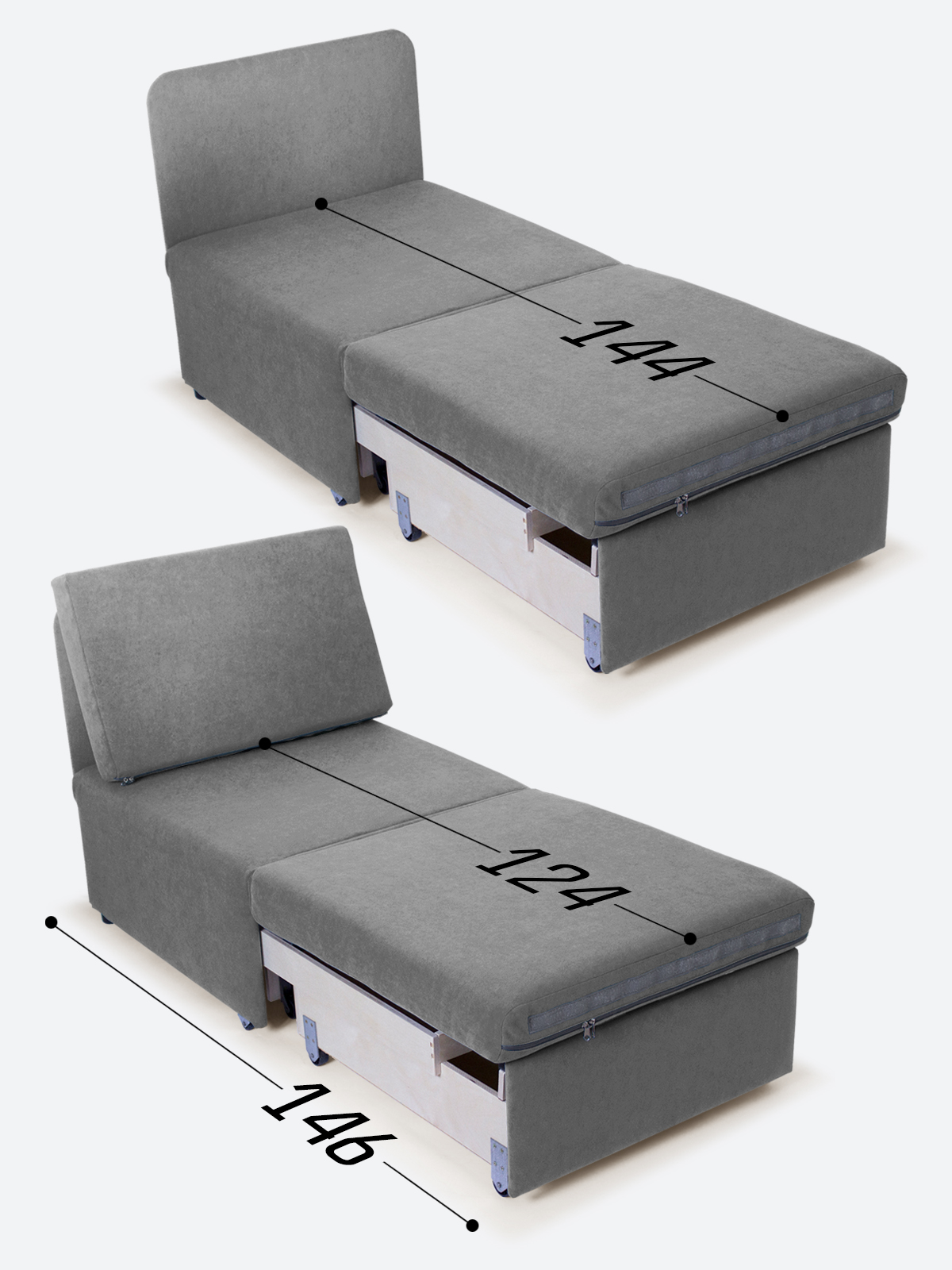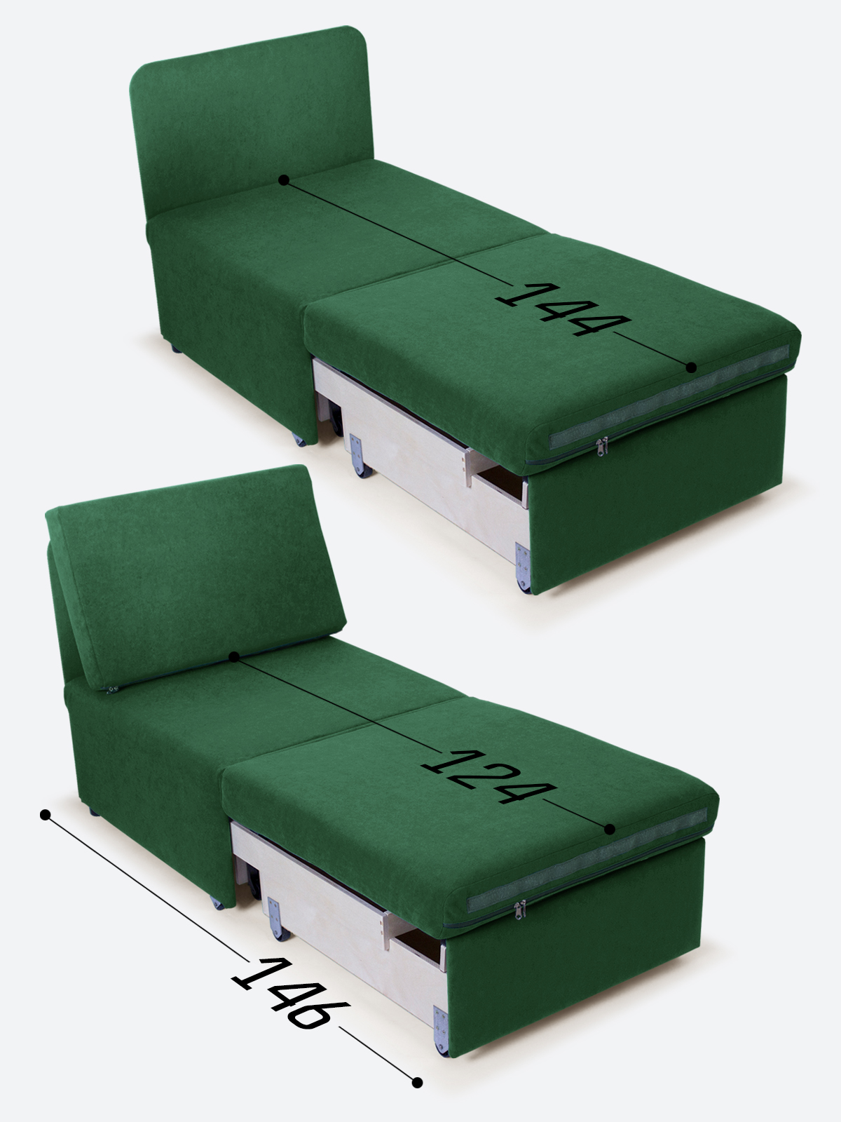 - спальное место, когда кресло разложено на 2/3 длины (кушетка/на вырост) - 65х144х35;
