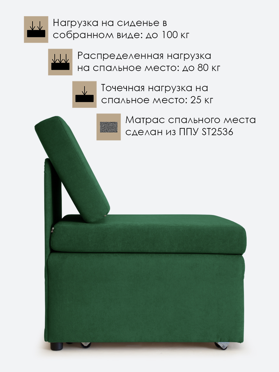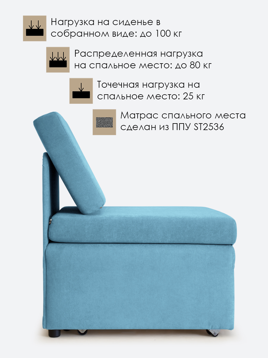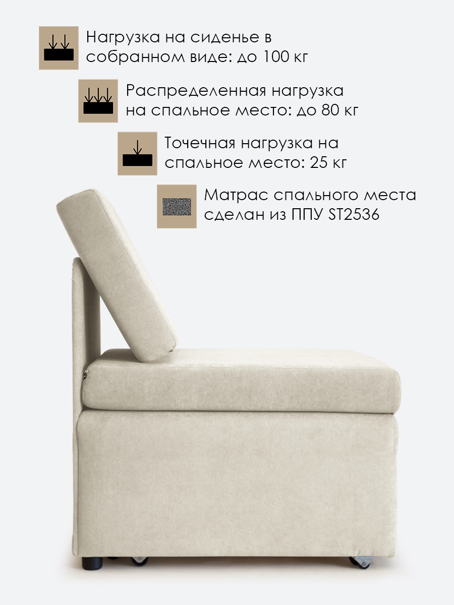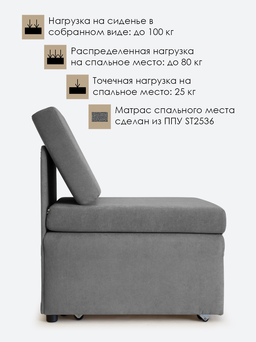 - распределенная нагрузка на спальное место - 80 кг, точечная нагрузка* на спальное место - 25 кг. Нагрузка на кресло в собранном виде - 100 кг.