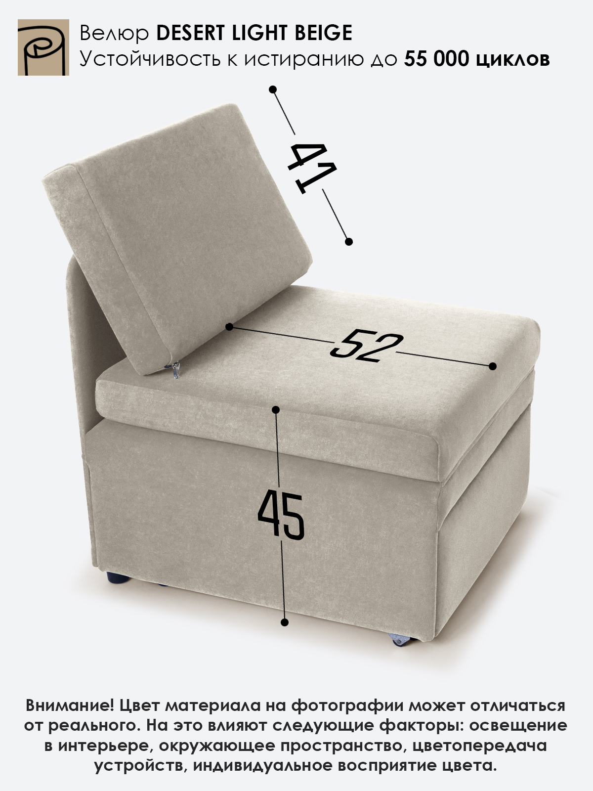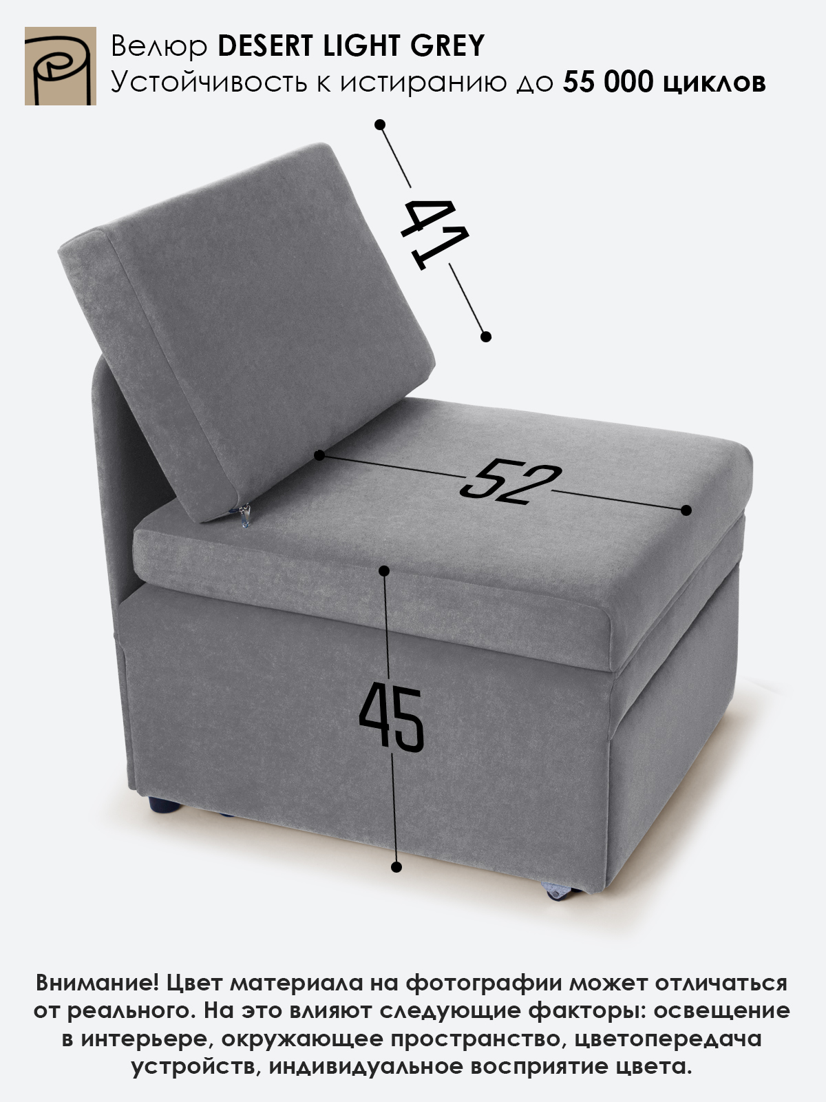 Материал обивки: Велюр. Съемный чехол только на подушке спинки.