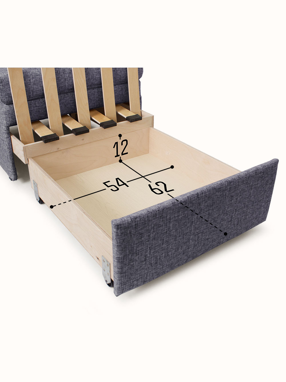 Материал каркаса: Шлифованная березовая фанера, березовые латы, сосновые бруски; дно ящика - ДВПО.