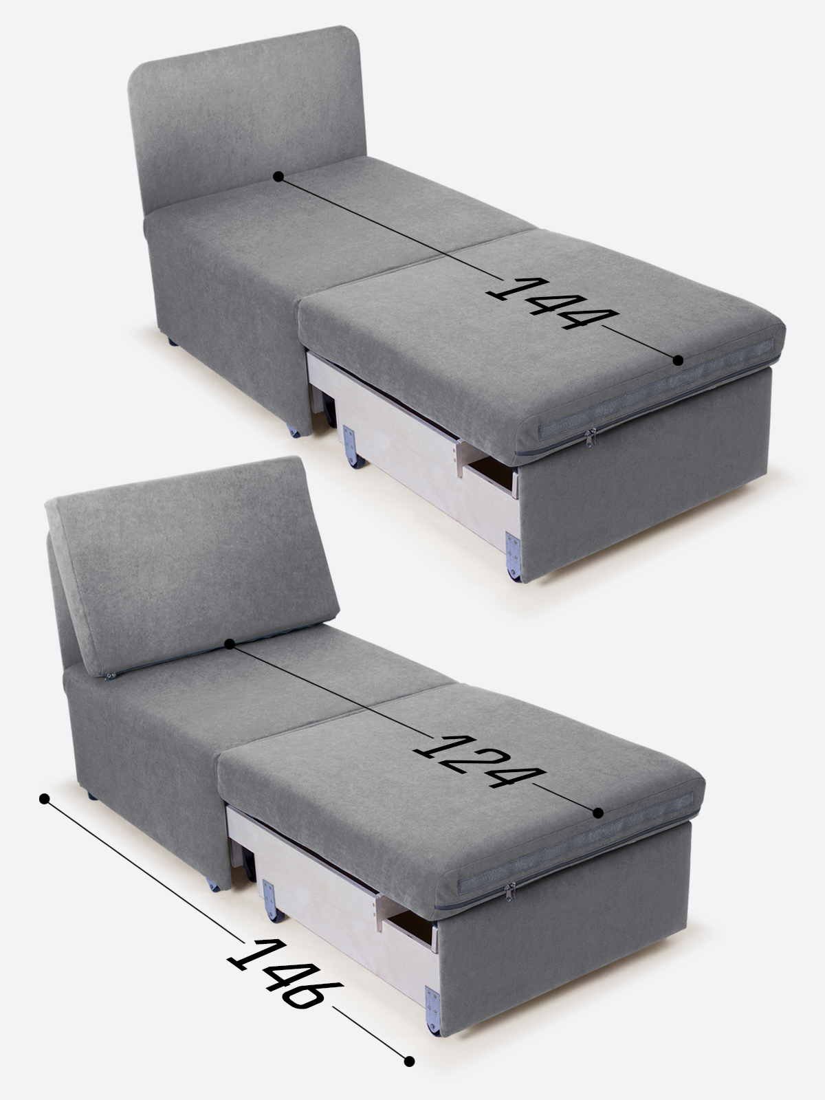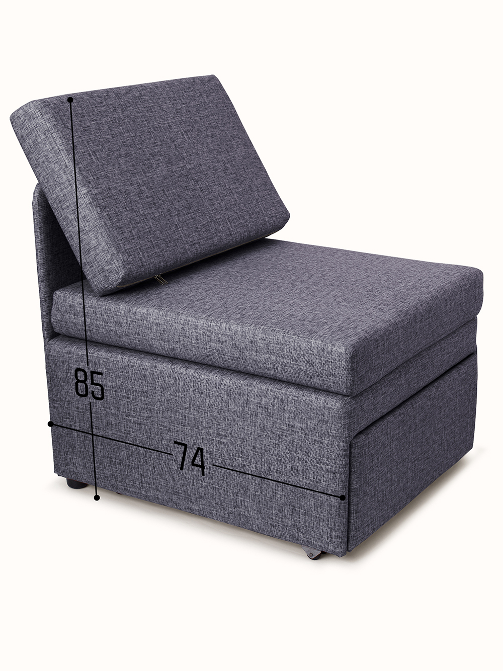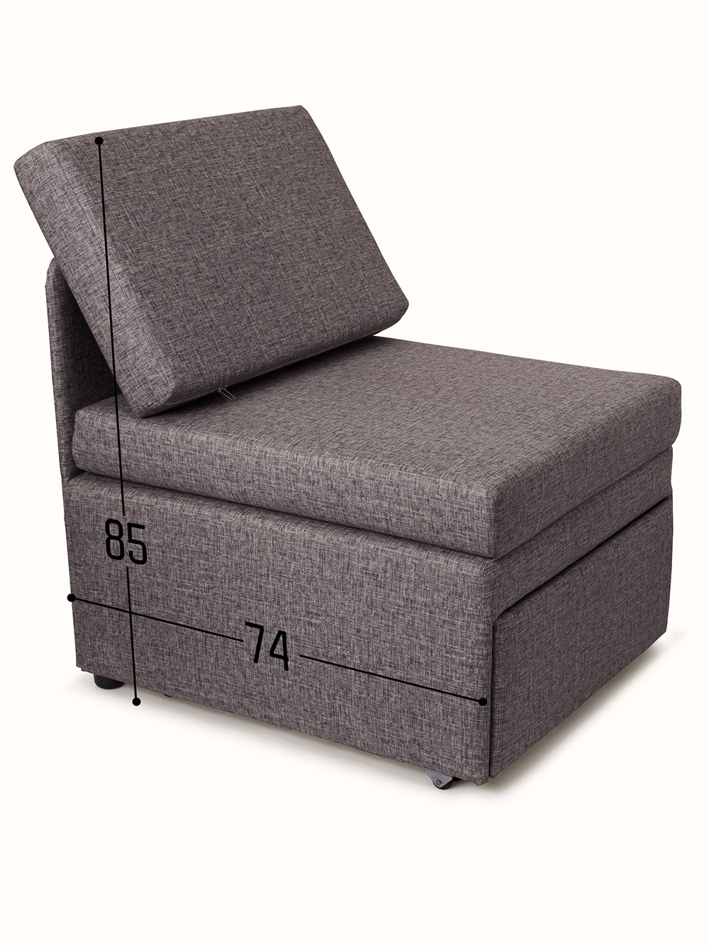 Обращаем Ваше внимание, что в разложенном виде кресло-кровать может скользить на глянцевом полу, т.к. стоит на двух ножках и колесах. Размер и конструкция колес не предполагает наличие стопора (тормоза). В комплект входят два антискользящих подпятника, которые нужно приклеить на задние ножки.