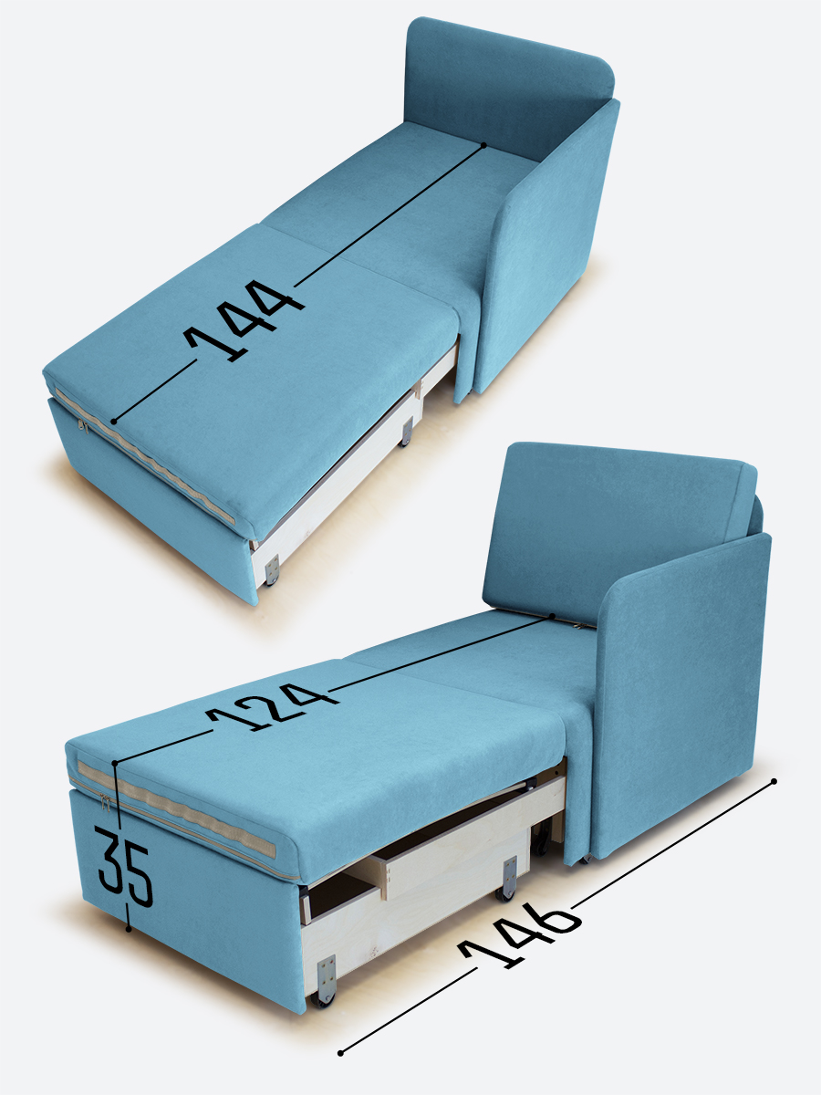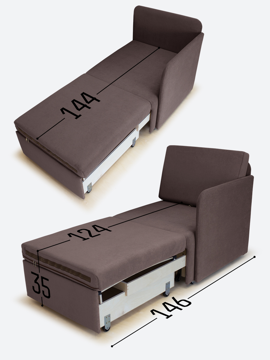 • спальное место, когда кресло разложено на 2/3 длины (кушетка/на вырост) - 65х144х35 см.