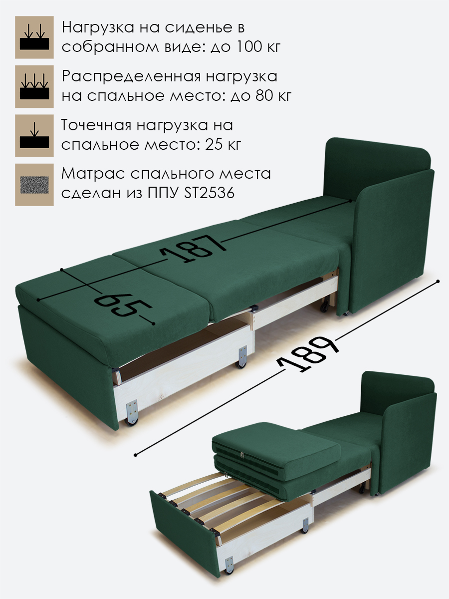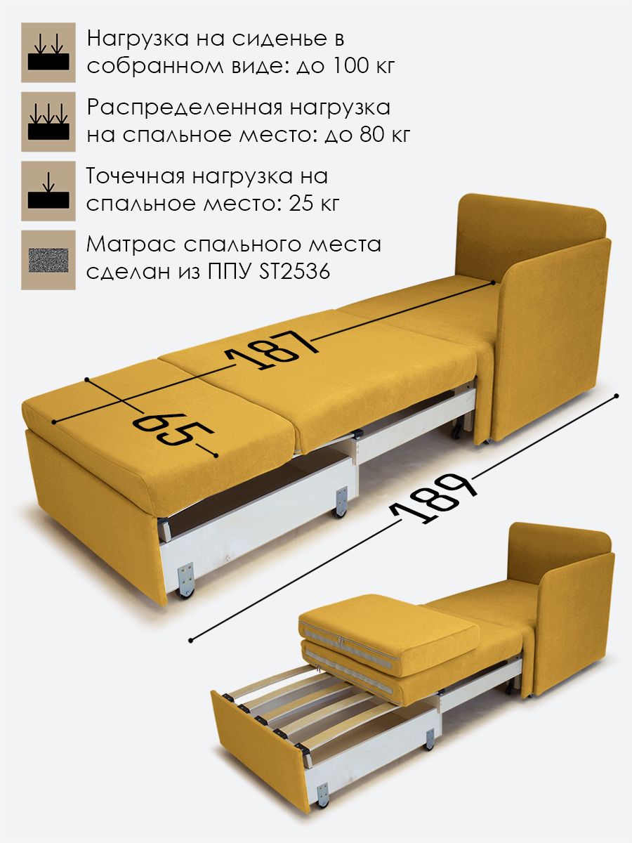 • распределенная нагрузка на спальное место - 80 кг, точечная нагрузка* на спальное место - 25 кг. Нагрузка на кресло в собранном виде - 100 кг.