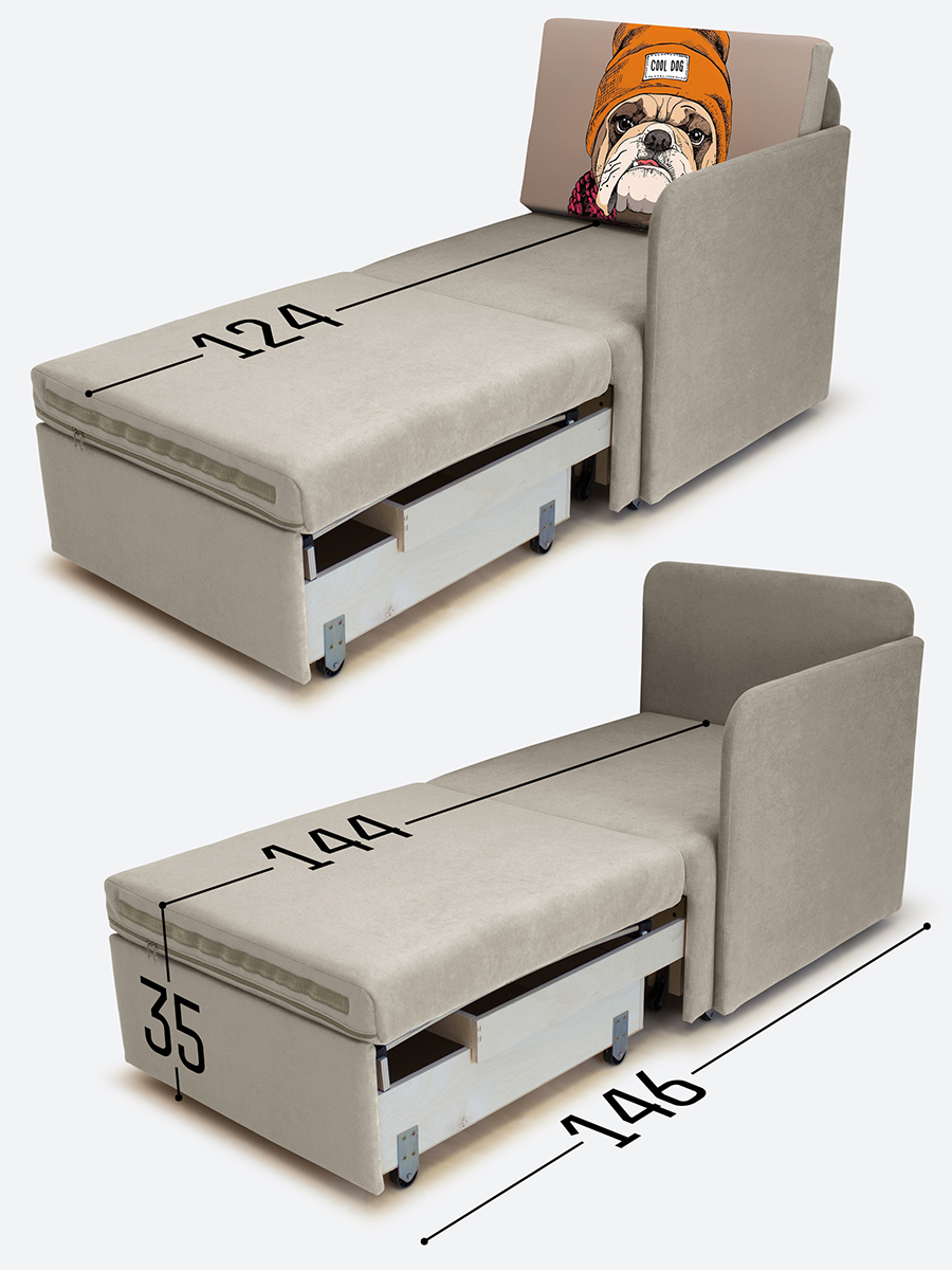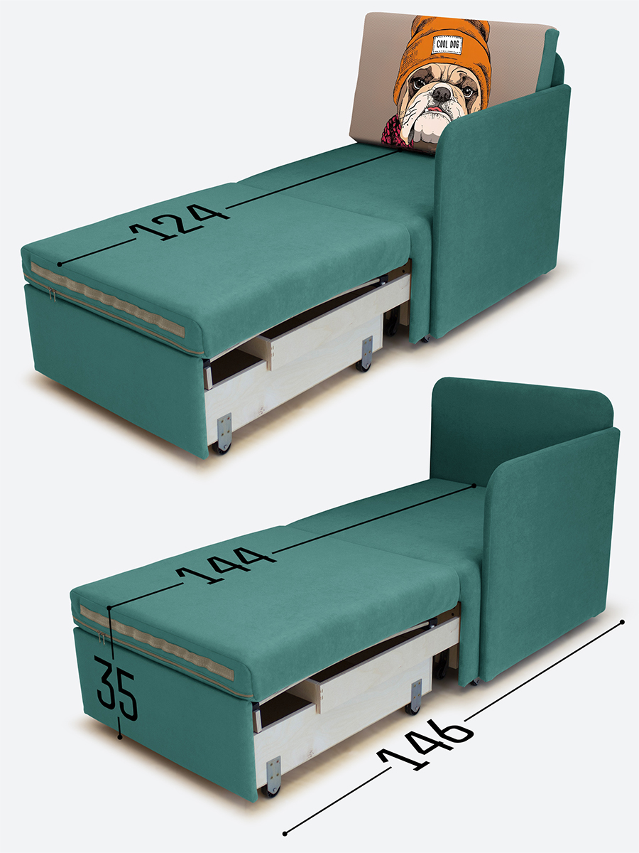 - спальное место, когда кресло разложено на 2/3 длины (кушетка/на вырост) - 65х144х35 см.