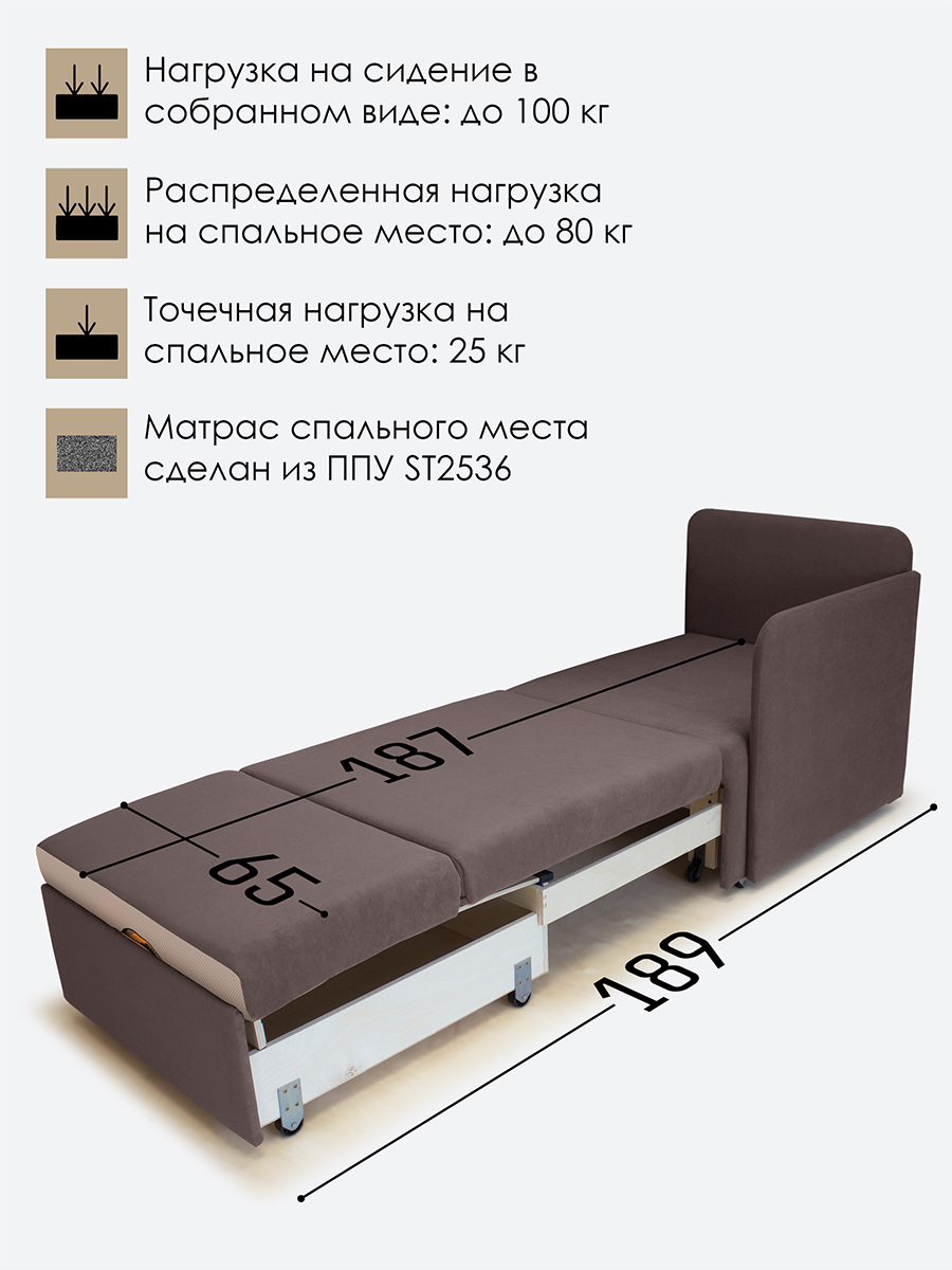 - распределенная нагрузка на спальное место - 80 кг, точечная нагрузка* на спальное место - 25 кг. Нагрузка на кресло в собранном виде - 100 кг.