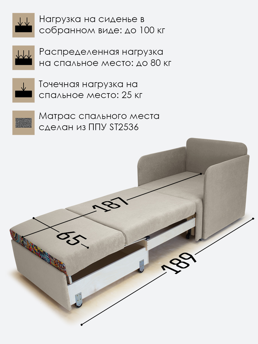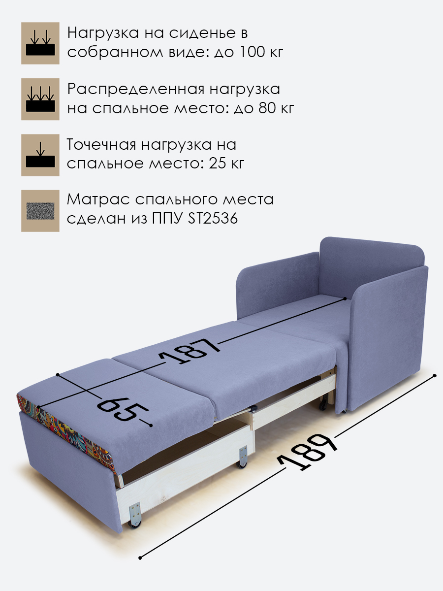 - распределенная нагрузка на спальное место - 80 кг, точечная нагрузка* на спальное место - 25 кг. Нагрузка на кресло в собранном виде - 100 кг.