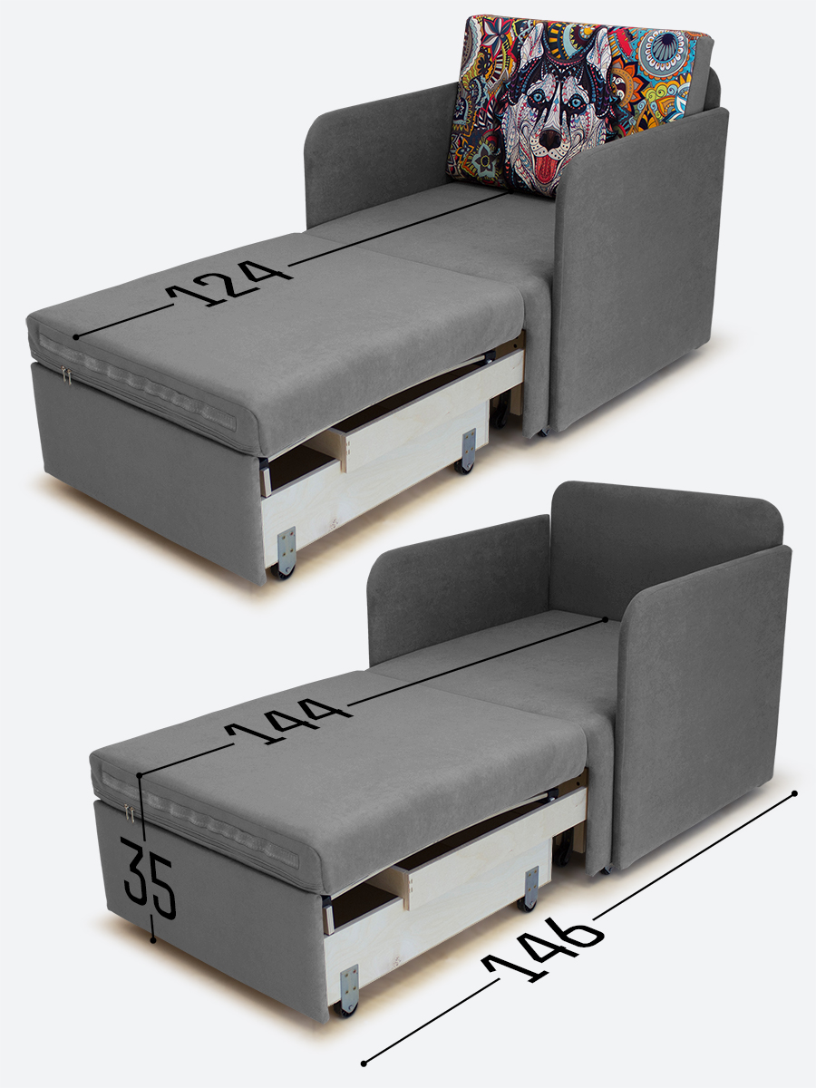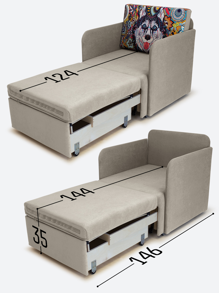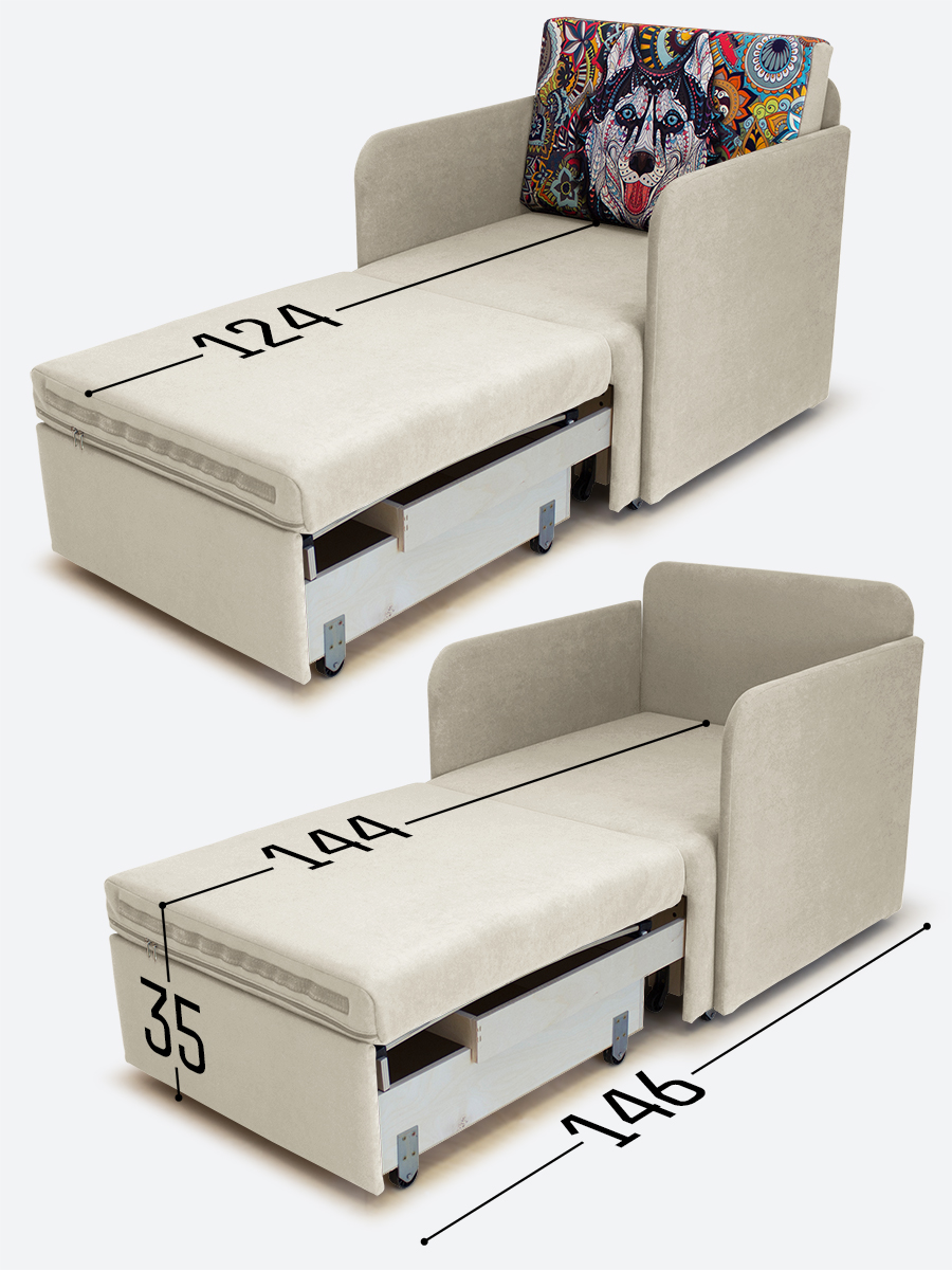 - спальное место, когда кресло разложено на 2/3 длины (кушетка/на вырост) - 65х144х35;