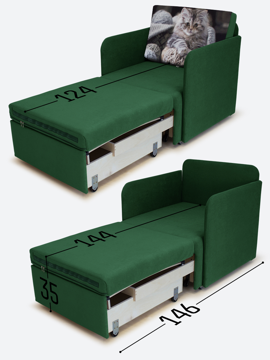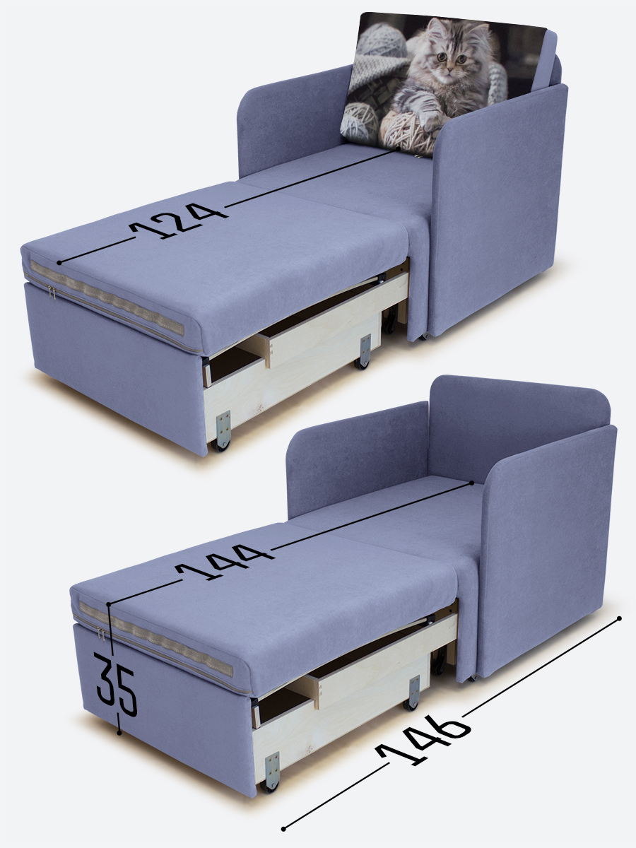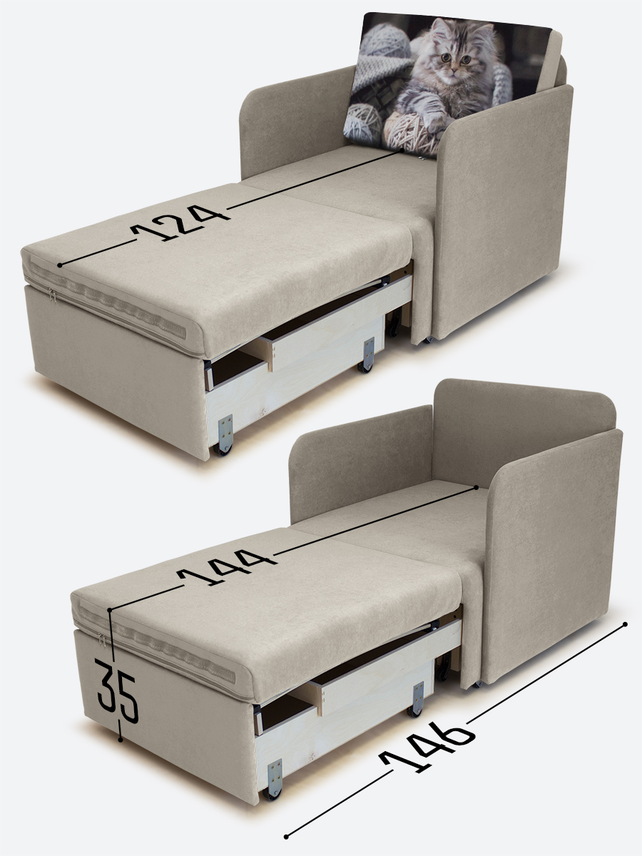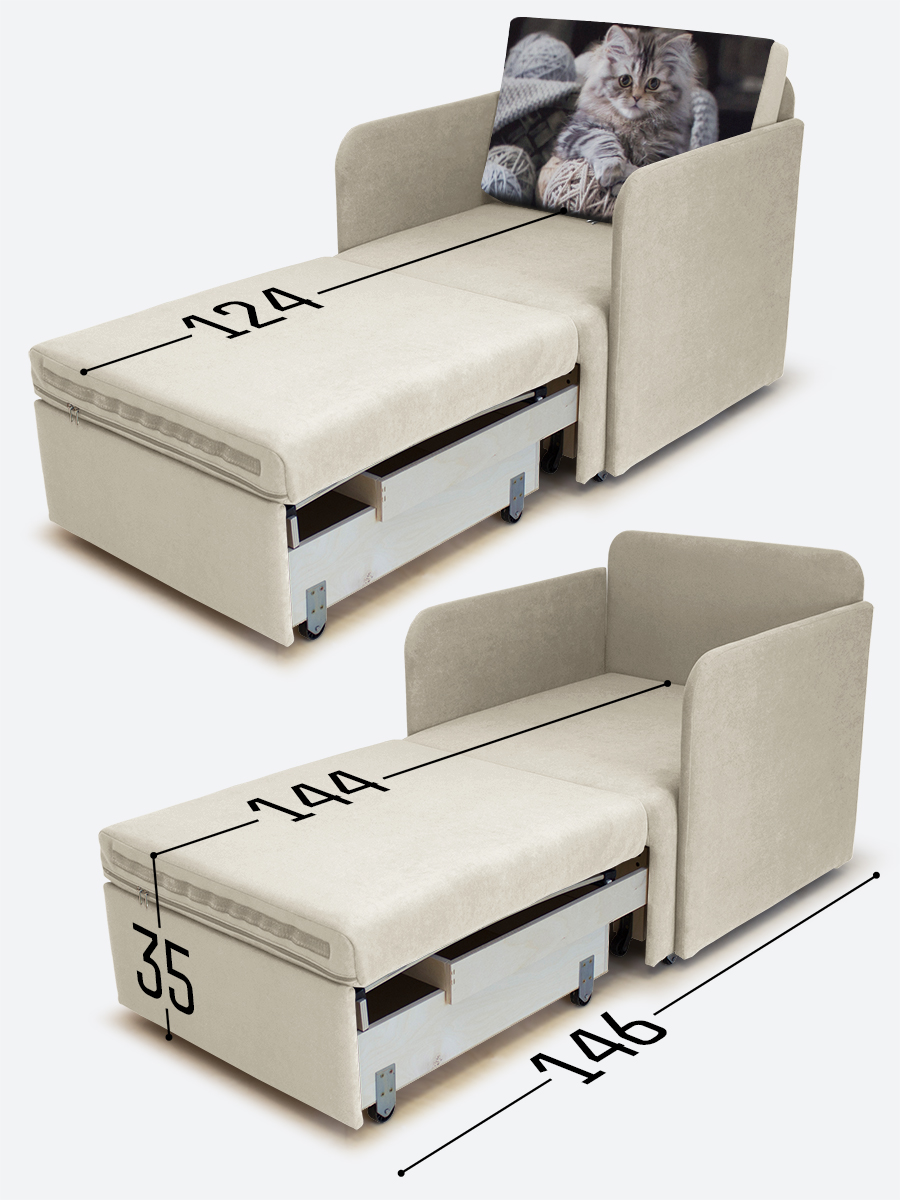 - спальное место, когда кресло разложено на 2/3 длины (кушетка/на вырост) - 65х144х35;