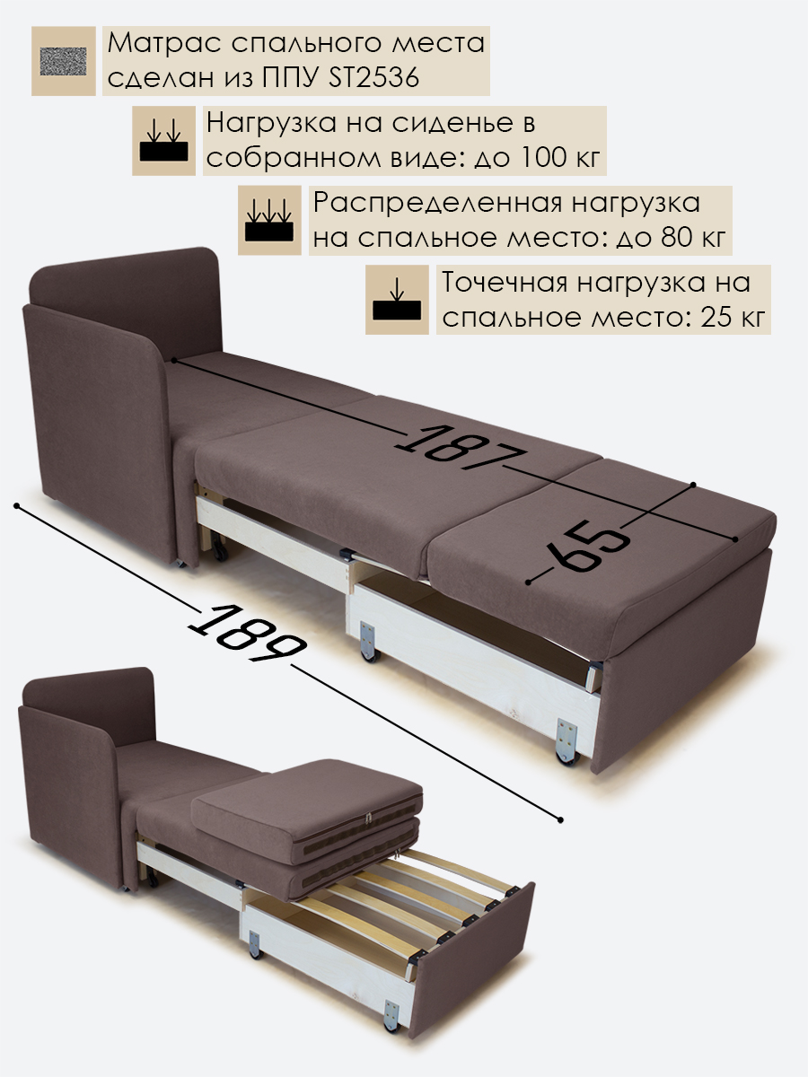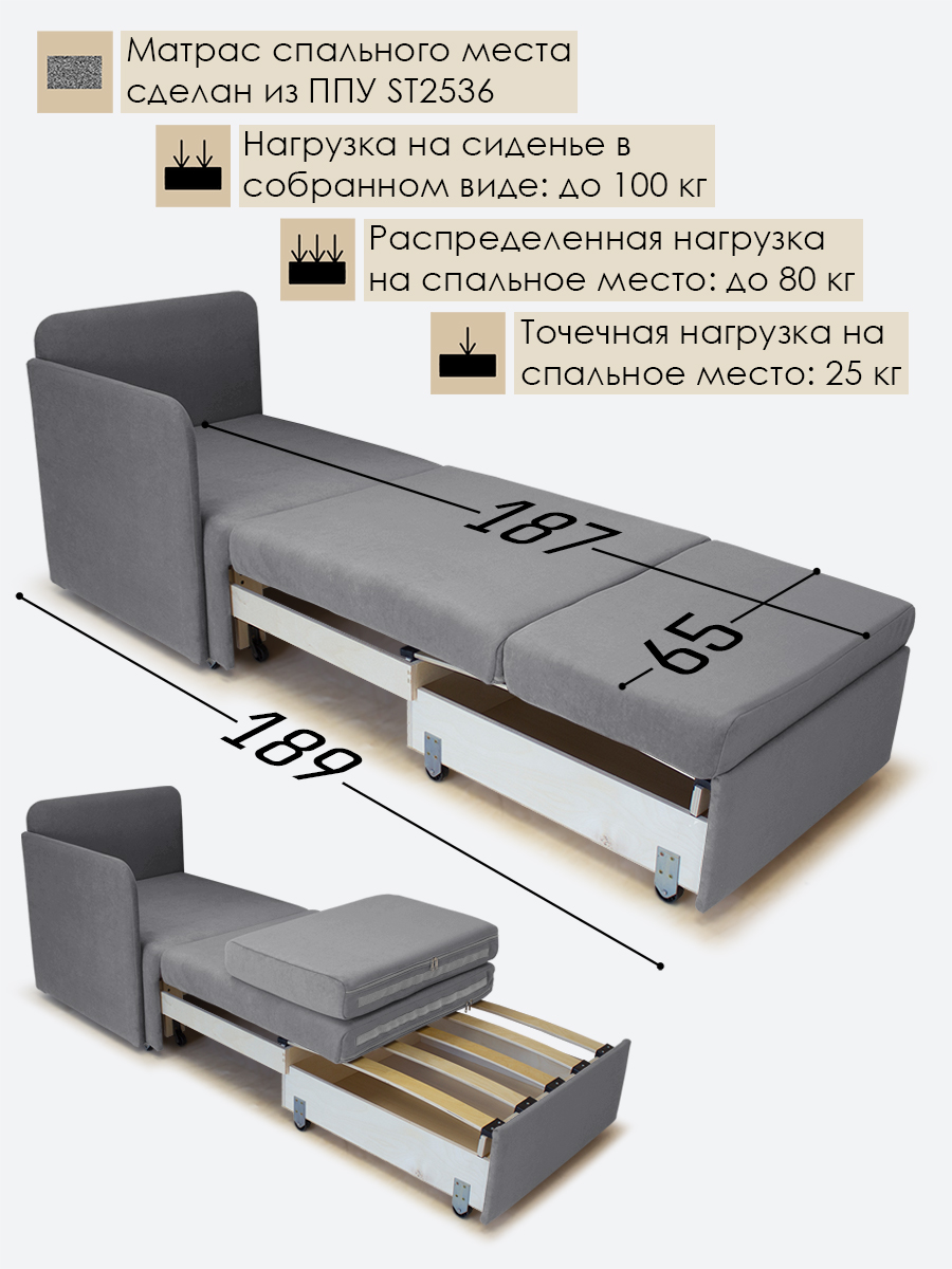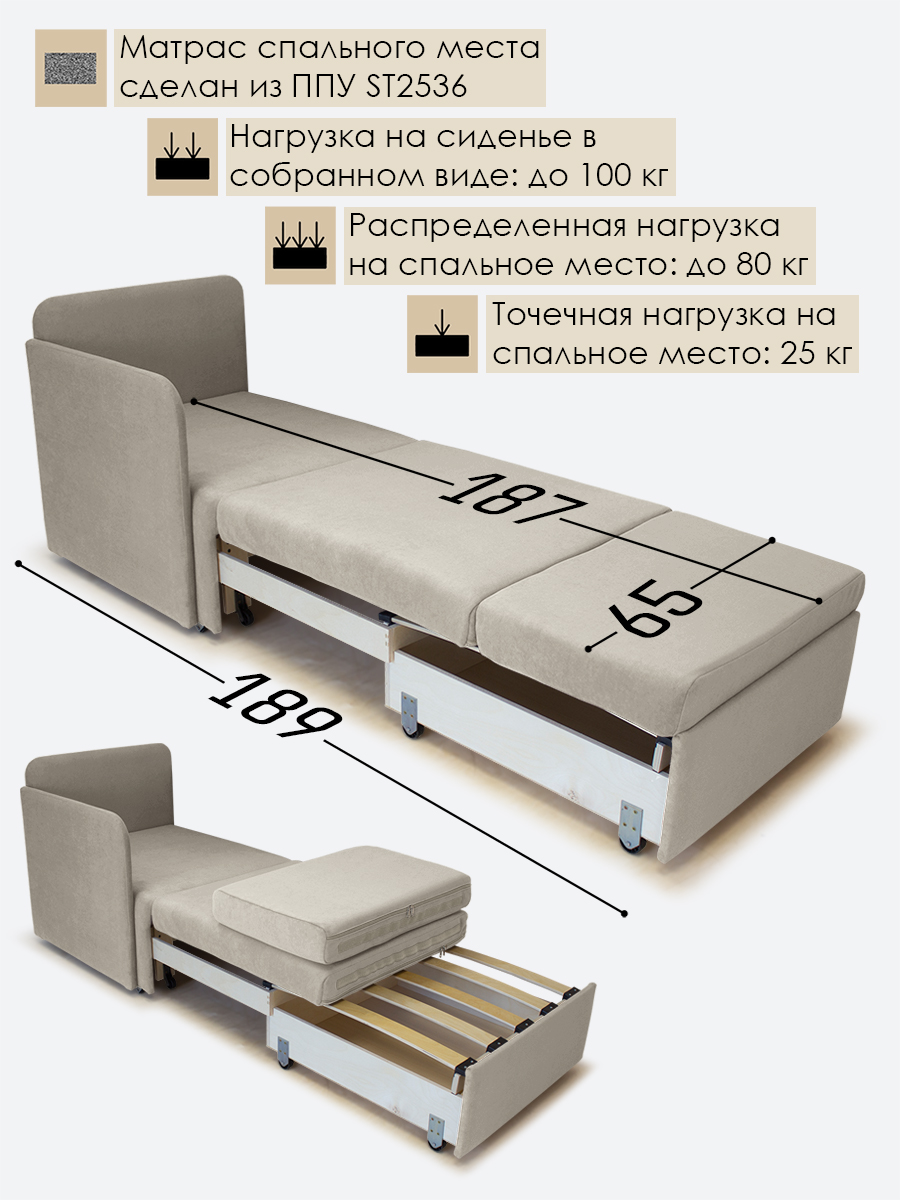 - распределенная нагрузка на спальное место - 80 кг, точечная нагрузка* на спальное место - 25 кг. Нагрузка на кресло в собранном виде - 100 кг.