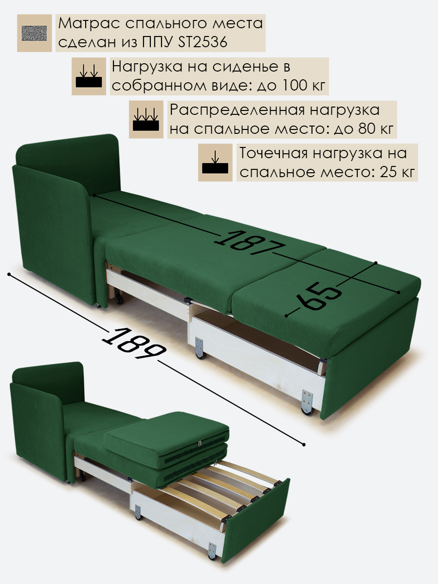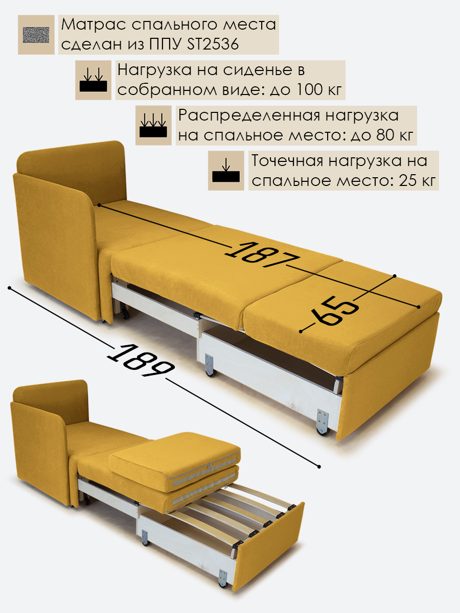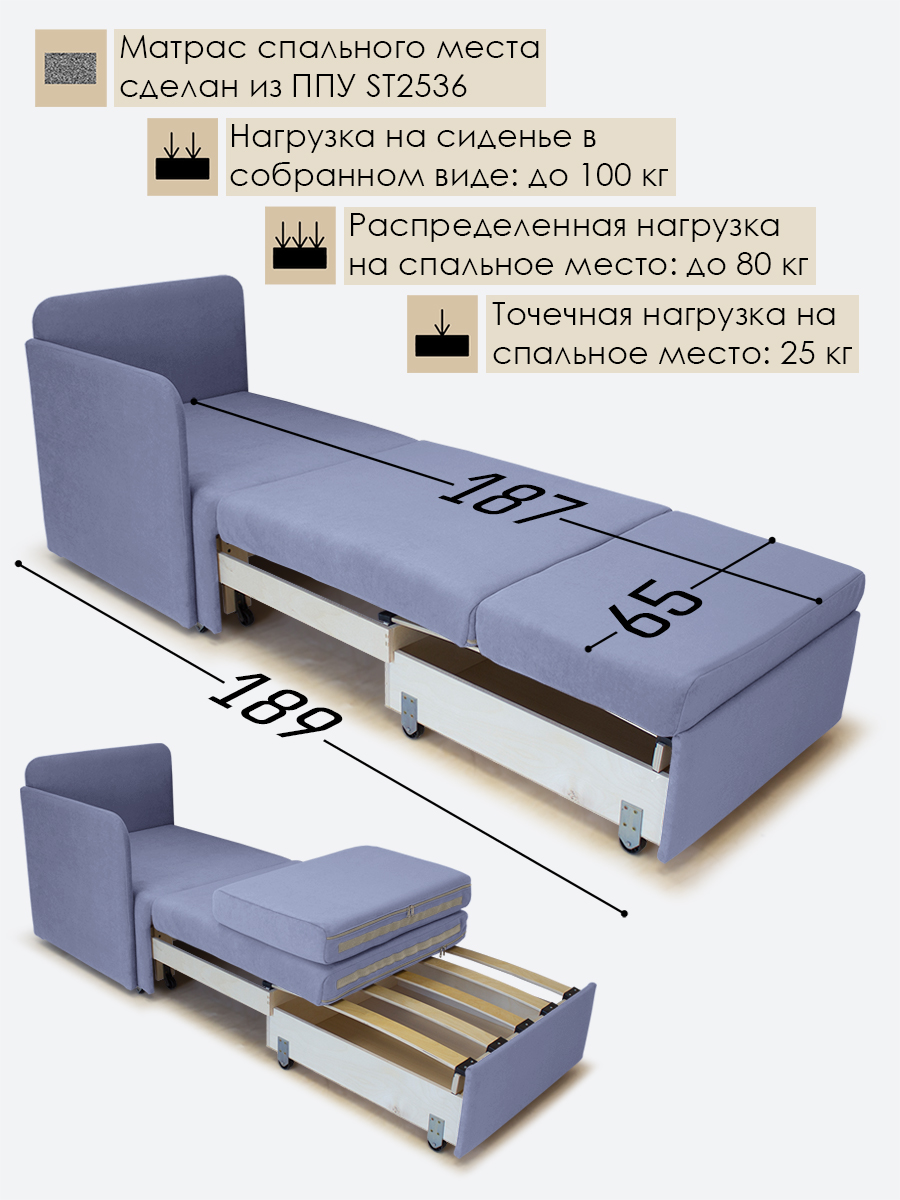 - распределенная нагрузка на спальное место - 80 кг, точечная нагрузка* на спальное место - 25 кг. Нагрузка на кресло в собранном виде - 100 кг.