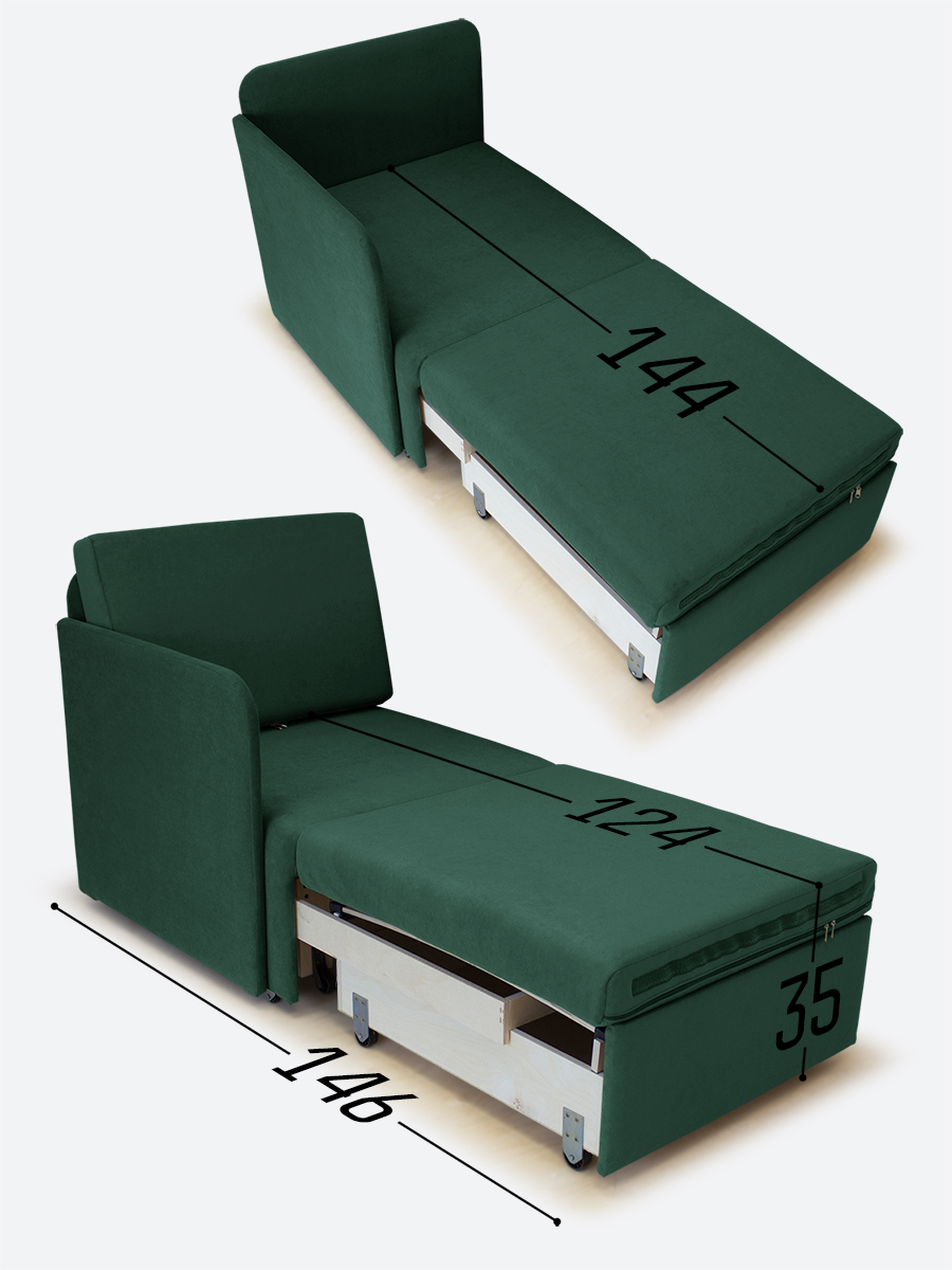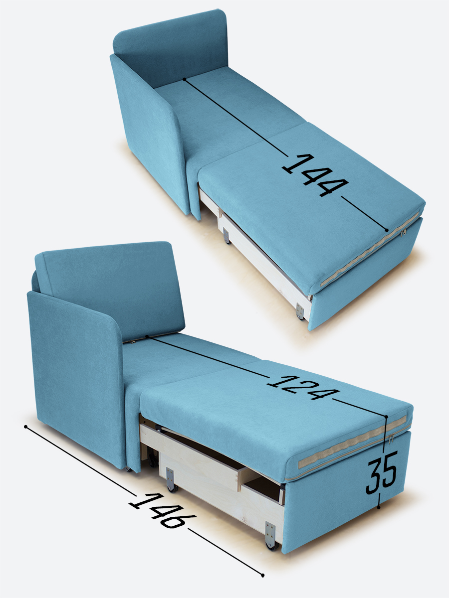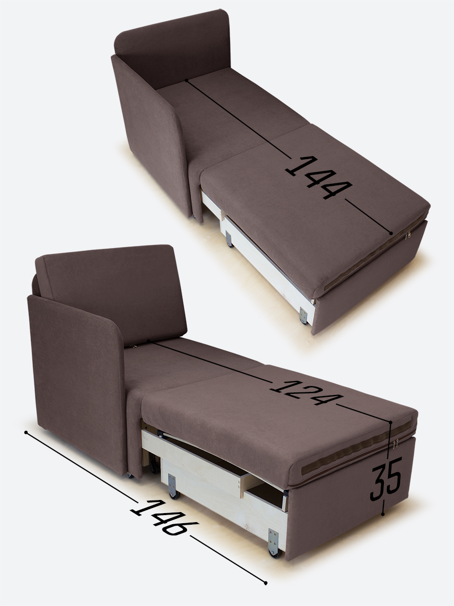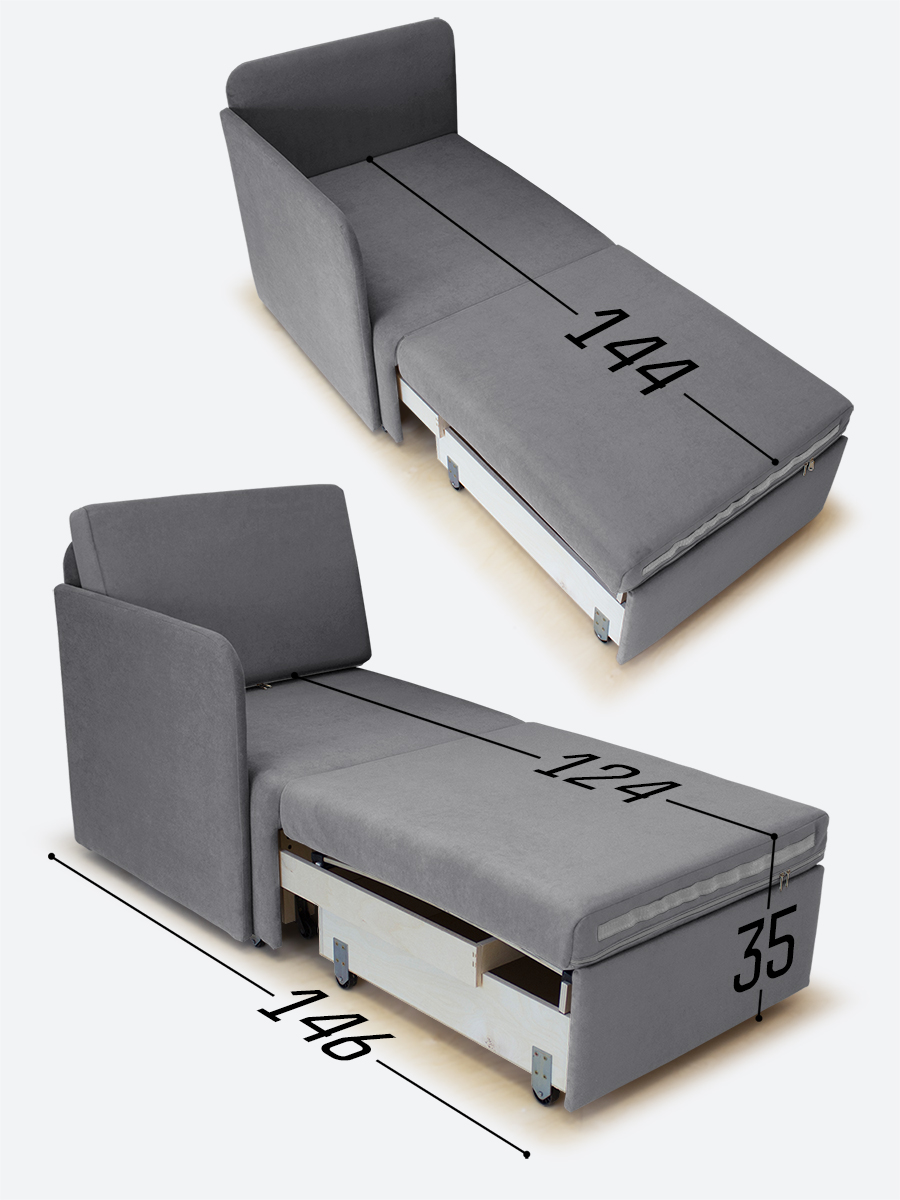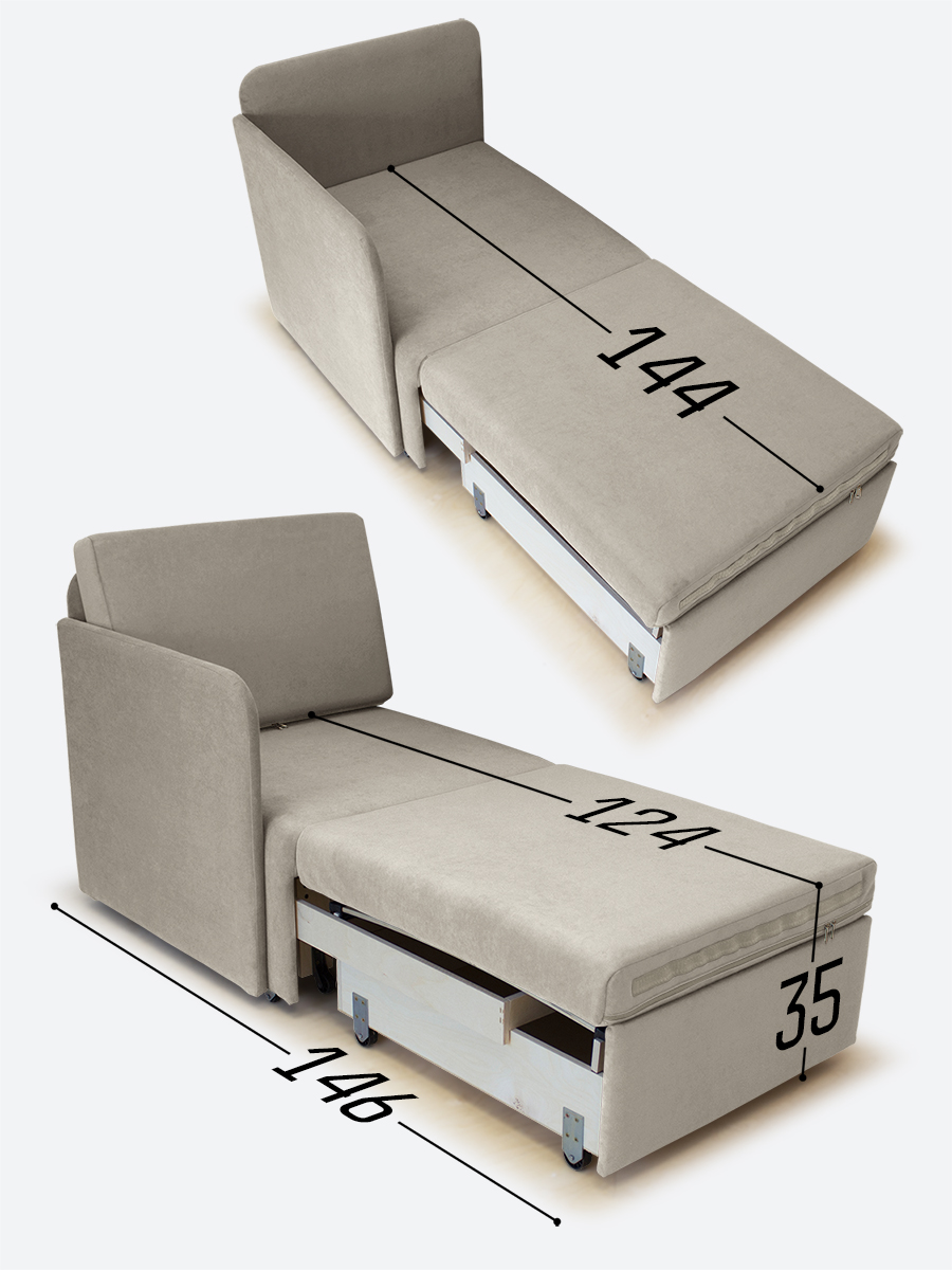 - спальное место, когда кресло разложено на 2/3 длины (кушетка/на вырост) - 65х144х35 см.
