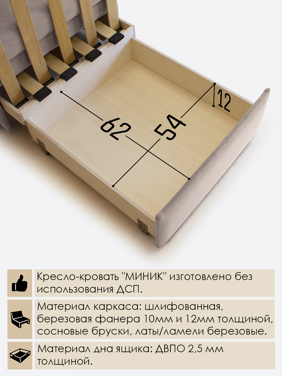 Материал каркаса: Шлифованная березовая фанера, березовые латы, сосновые бруски; дно ящика - ДВПО.