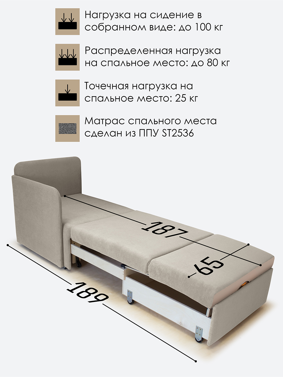 - распределенная нагрузка на спальное место - 80 кг, точечная нагрузка* на спальное место - 25 кг. Нагрузка на кресло в собранном виде - 100 кг.