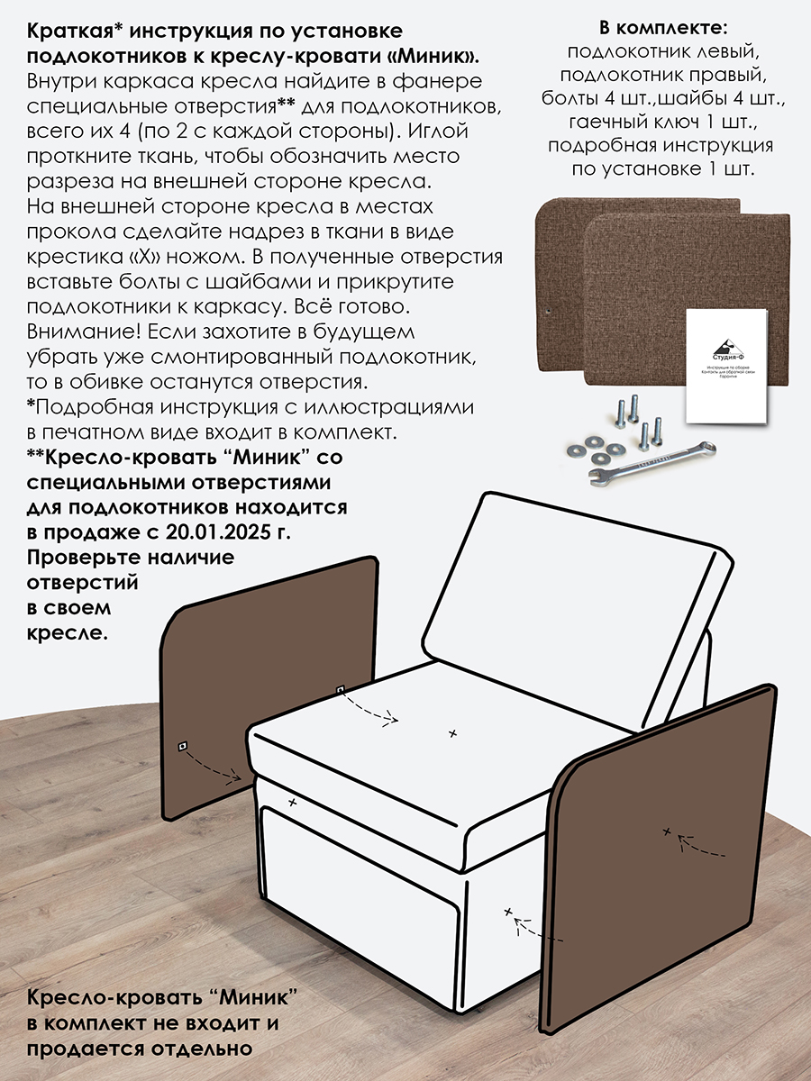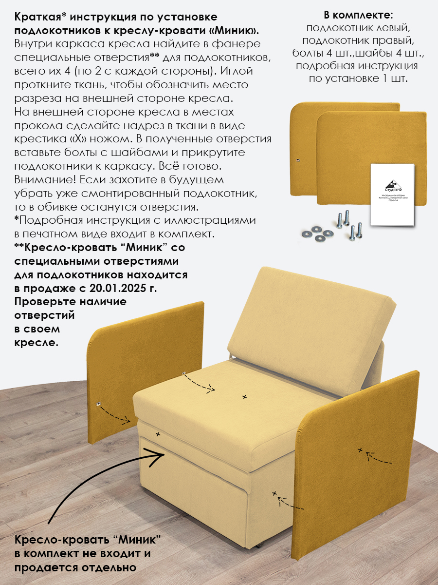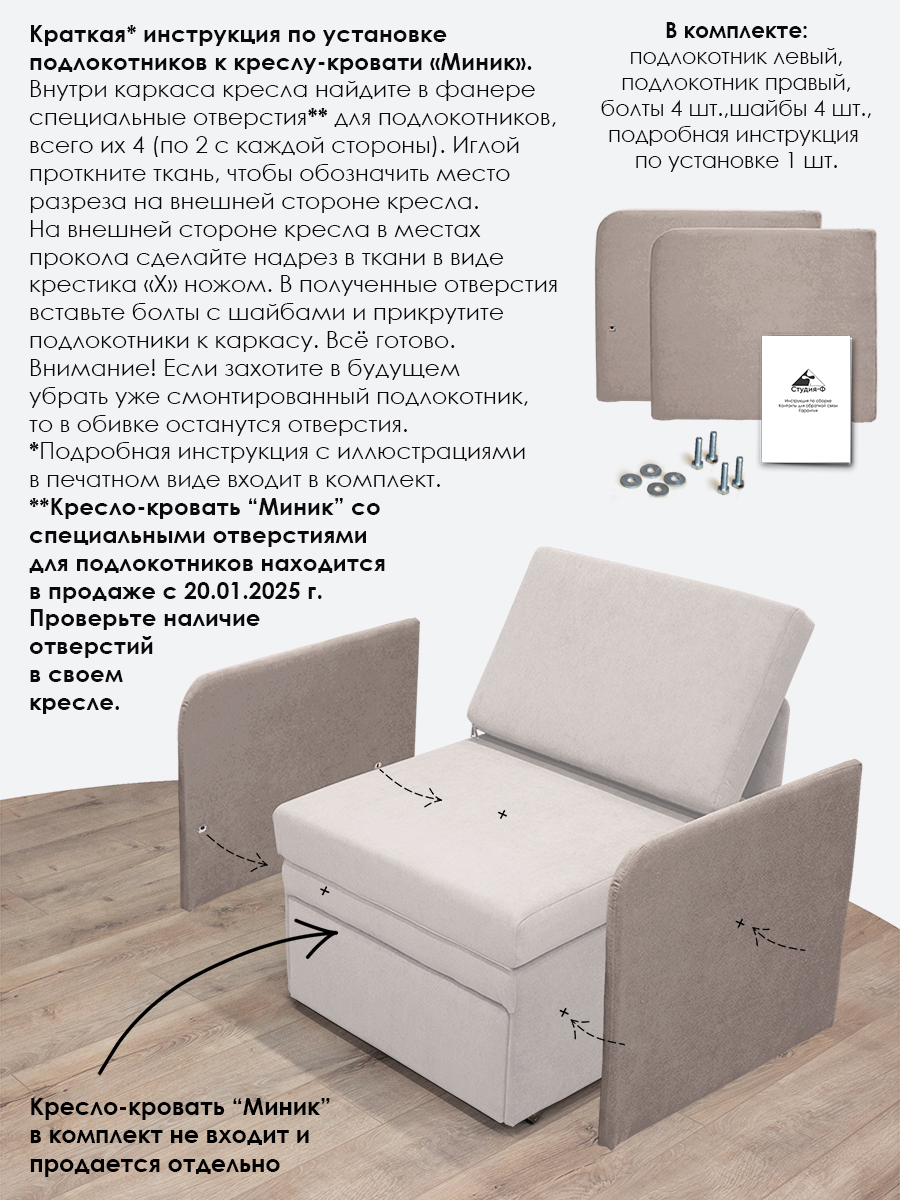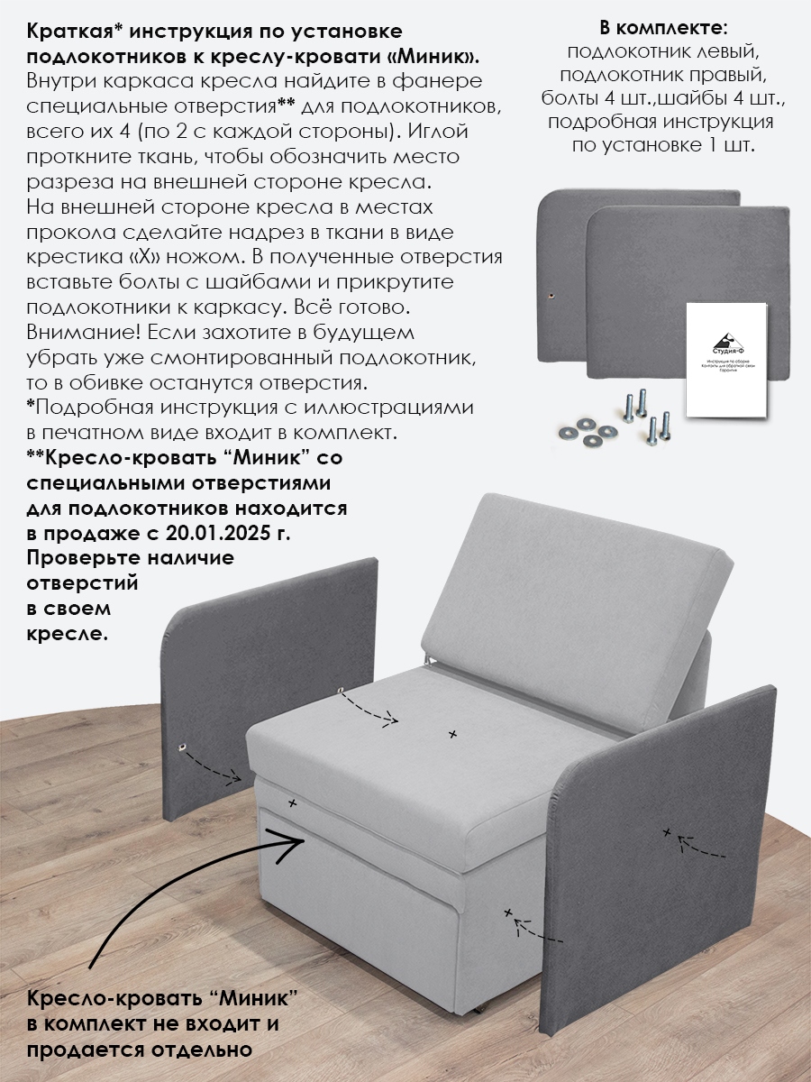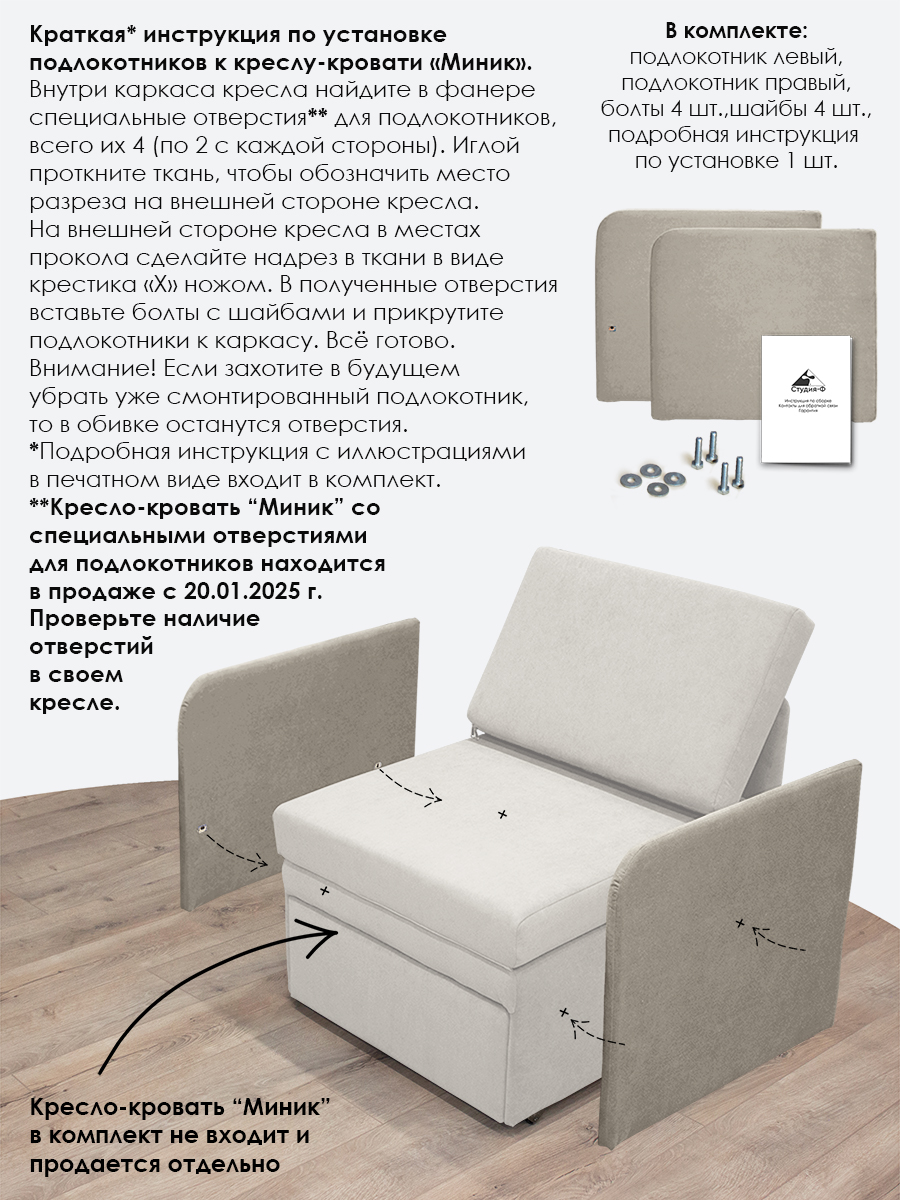 Обратите внимание, что подлокотник подойдет только для кресла-кровати "Миник" (с шириной спального места 65 см, 70 см, 80 см), который выпускается с 20 января 2025 г. Проверьте наличие специальных отверстий для подлокотников в своем кресле. Если остались вопросы, мы с радостью на них ответим!